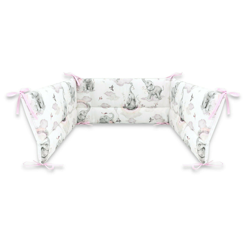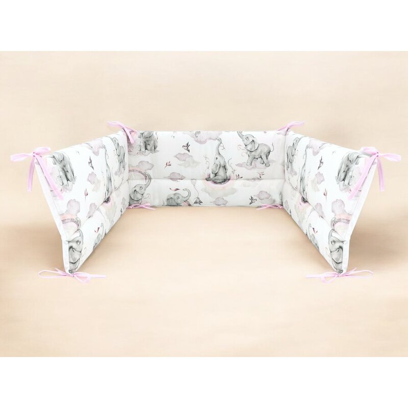 Aparatoare pentru patut, Qmini, Din bumbac certificat Oeko Tex Standard 100, 210x30 cm, Cu panglici, Elephants on Rainbow Pink