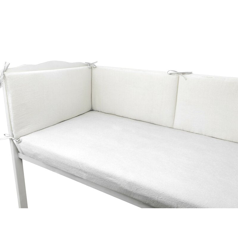Aparatoarea pentru patut Qmini, realizata din muselina dubla 100% bumbac certificat Oeko Tex Standard 100, este accesoriul ideal pentru siguranta si confortul copilului tau. Prevazuta cu panglici decorative, aceasta se fixeaza usor pe barele patutului si creeaza o atmosfera calda si sigura in camera copilului.