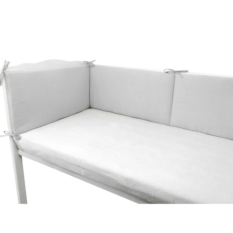 Aparatoarea pentru patut Qmini, realizata din muselina dubla 100% bumbac certificat Oeko Tex Standard 100, este accesoriul ideal pentru siguranta si confortul copilului tau. Prevazuta cu panglici decorative, aceasta se fixeaza usor pe barele patutului si creeaza o atmosfera calda si sigura in camera copilului.