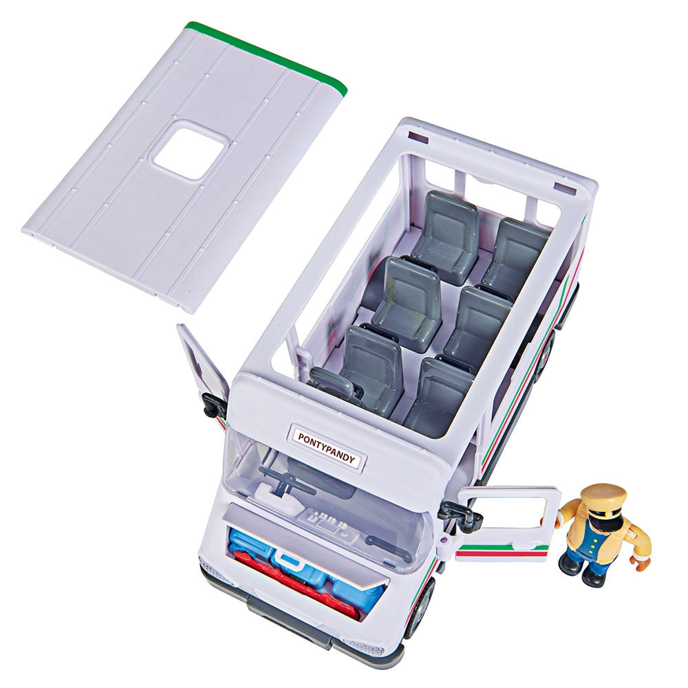 - Include un autobuz cu doua benzi de-a lungul vehiculului, o figurina Trevor cu articulatii mobile si accesorii tematice mici: 6 indicatoare rutiere, 2 marcaje ale statiei de autobuz, 3 conuri, palaria soferului