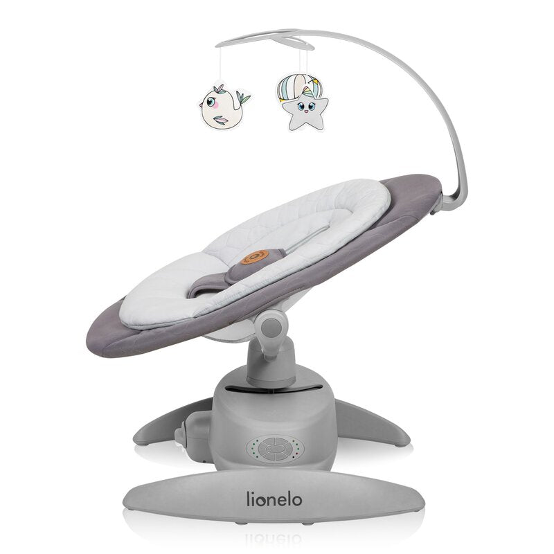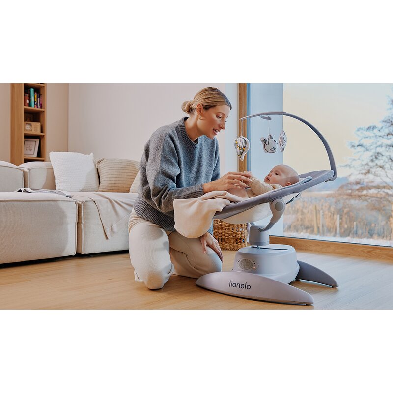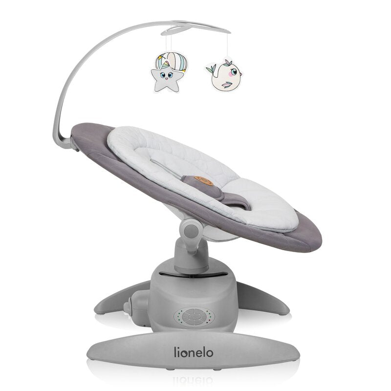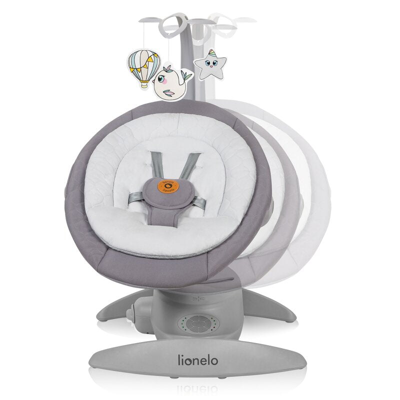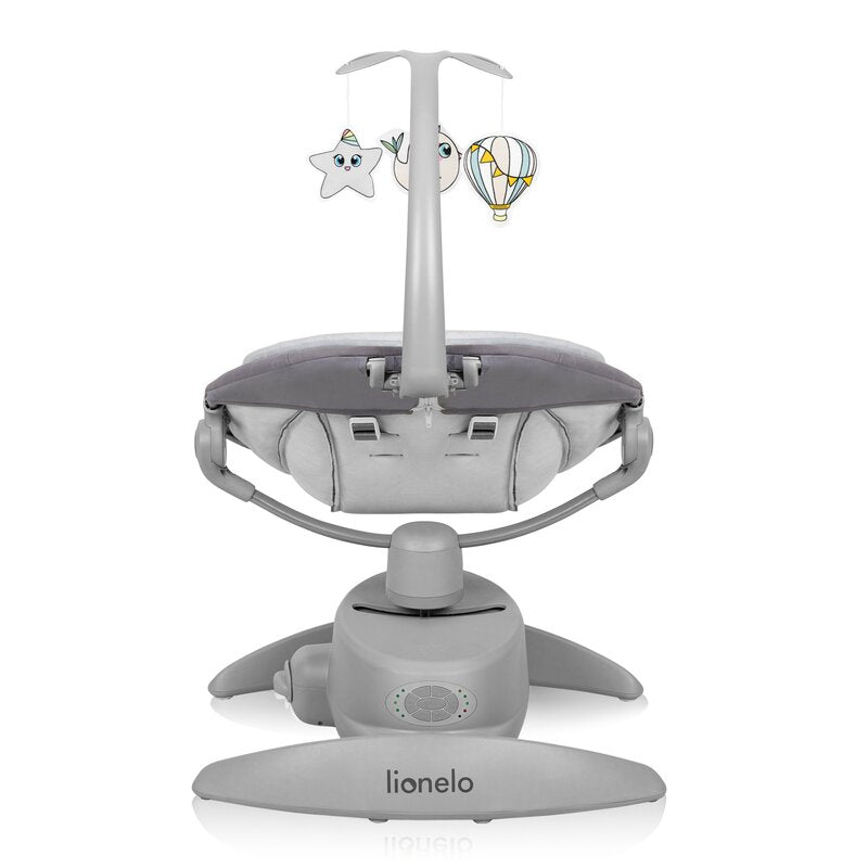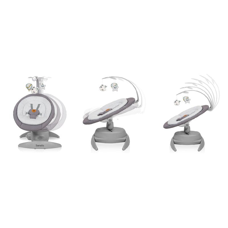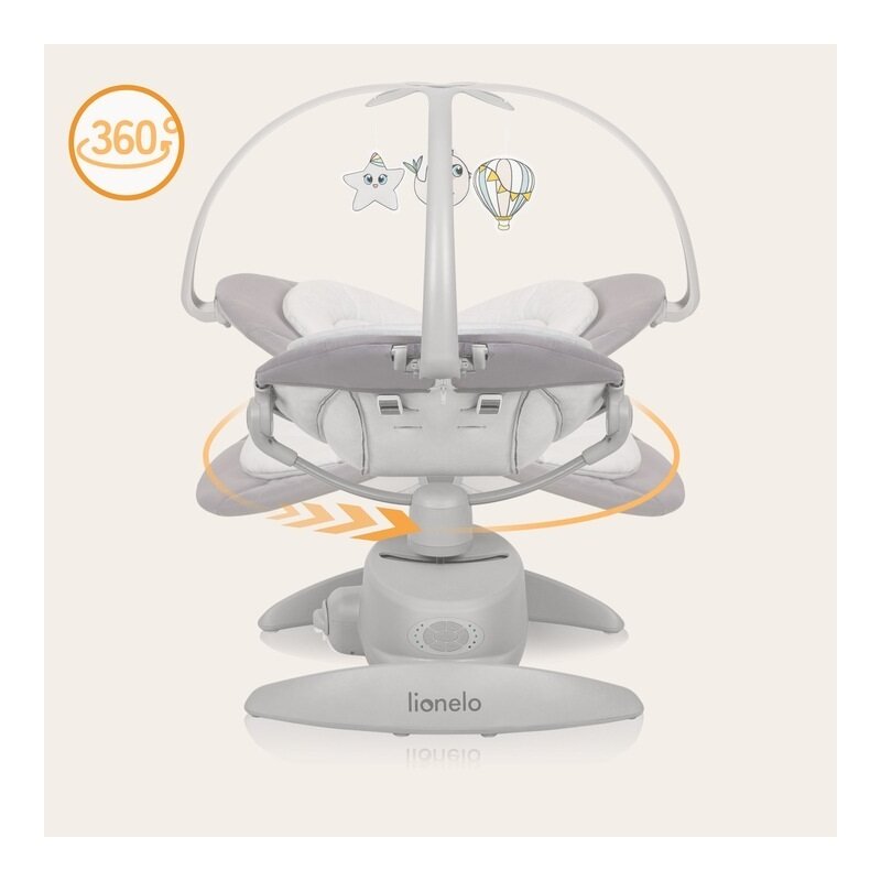 Balansoar, Lionelo, Mell, 2 in 1, Rotire 360 grade, Electric, Cu 3 moduri de leganare, Cu 5 trepte de viteza, Cu 3 pozitii de inclinare, Cu timer, 12 melodii si 2 sunete ale naturii, Pana la 9 kg, Gri
