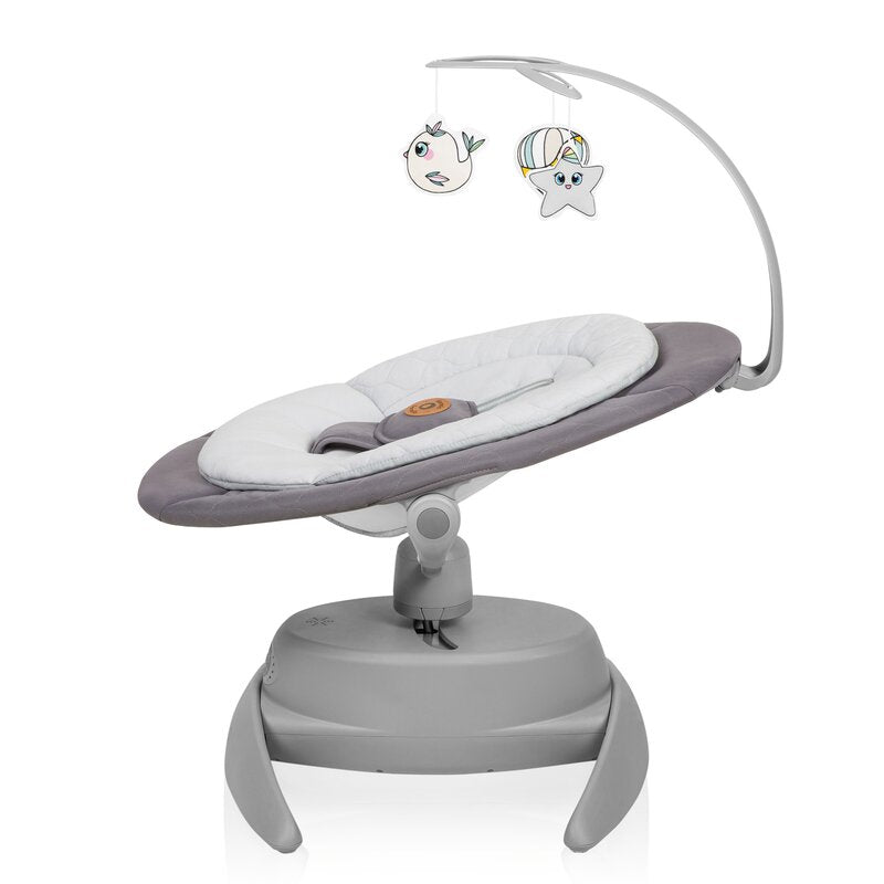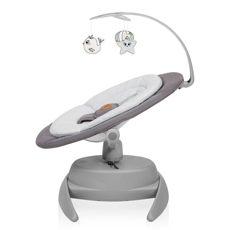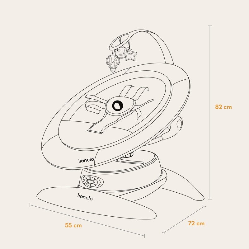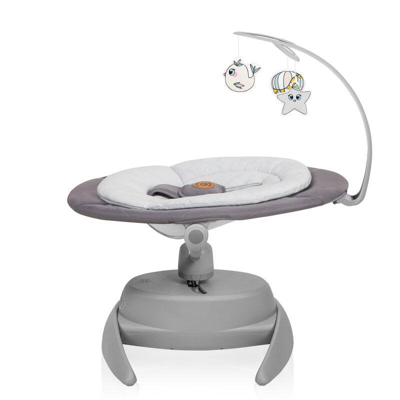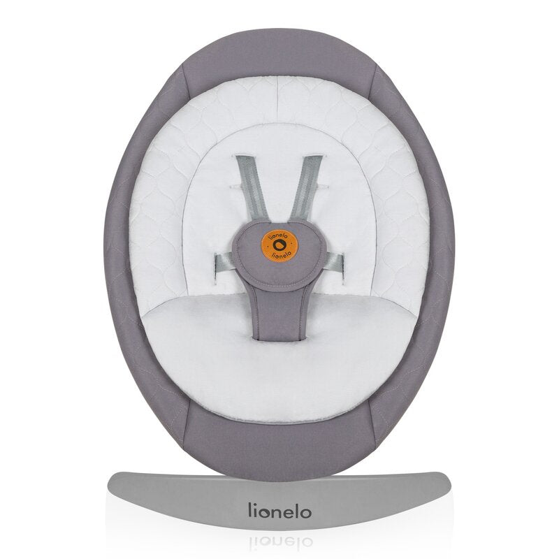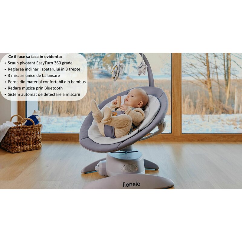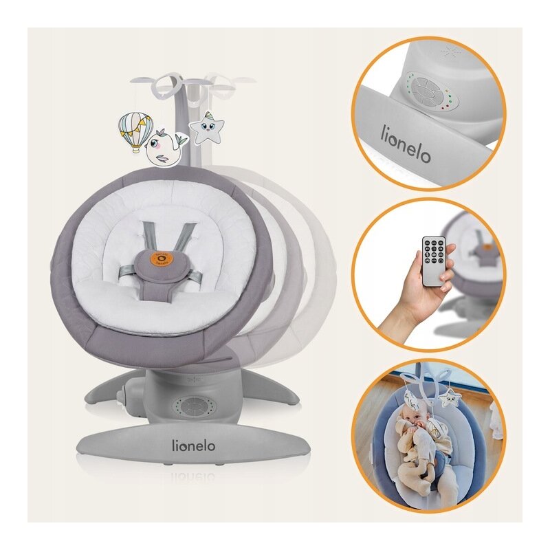 Balansoar, Lionelo, Mell, 2 in 1, Rotire 360 grade, Electric, Cu 3 moduri de leganare, Cu 5 trepte de viteza, Cu 3 pozitii de inclinare, Cu timer, 12 melodii si 2 sunete ale naturii, Pana la 9 kg, Gri