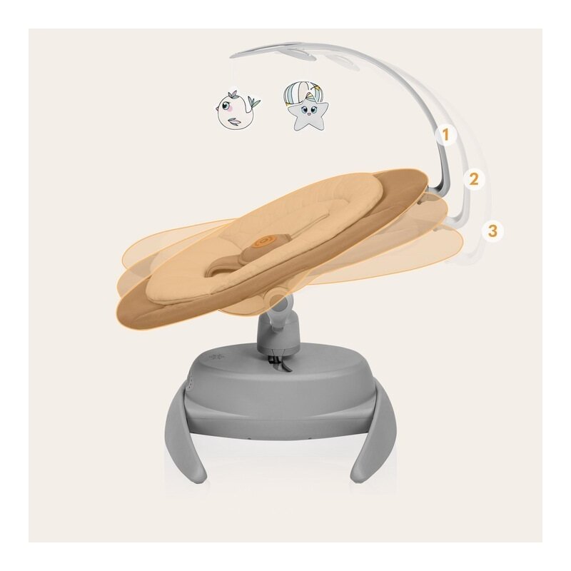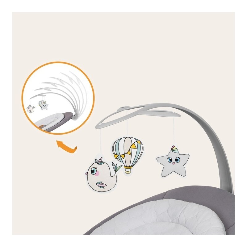 Balansoarul are 12 melodii presalvate si 2 sunete naturale cu reglare a volumului. Conectivitatea Bluetooth permite redarea melodiilor selectate pentru copil. Bara de jucarie detasabila si reglabila, completata cu un set de jucarii, il tine pe micut distrat si il incurajeaza sa ajunga si sa isi intinda bratele.
