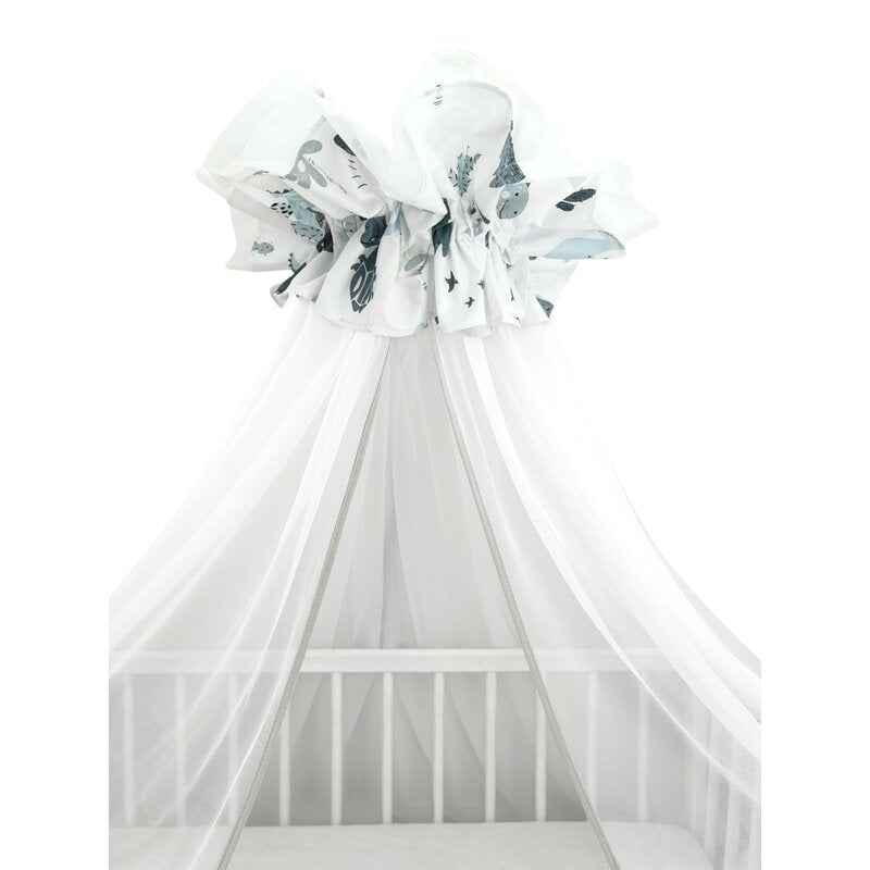 - Baldachinul este realizat din tul, ale carui ochiuri mici permit o buna ventilare a aerului, ferind totodata bebelusul de insecte.