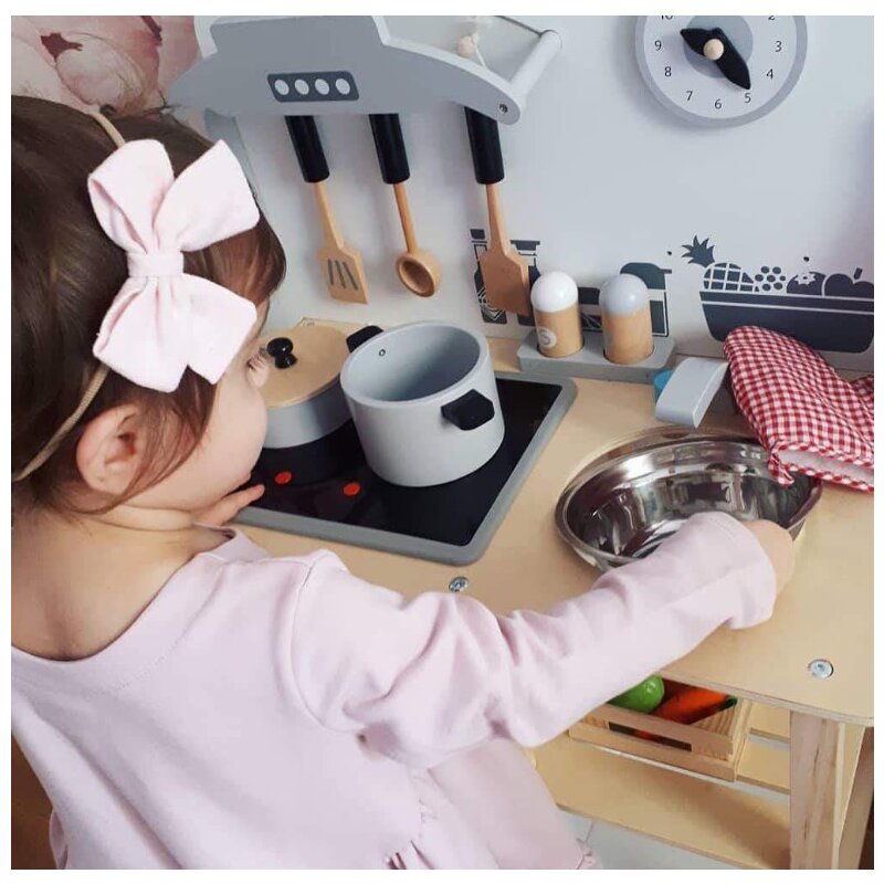Raspunsul este: copilul tau! Cu aceasta bucatarie din lemn, frumos colorata si atent finisata, micutul tau va avea ocazia sa exploreze universul culinar prin jocuri de rol educative, interactive si pline de farmec.✨