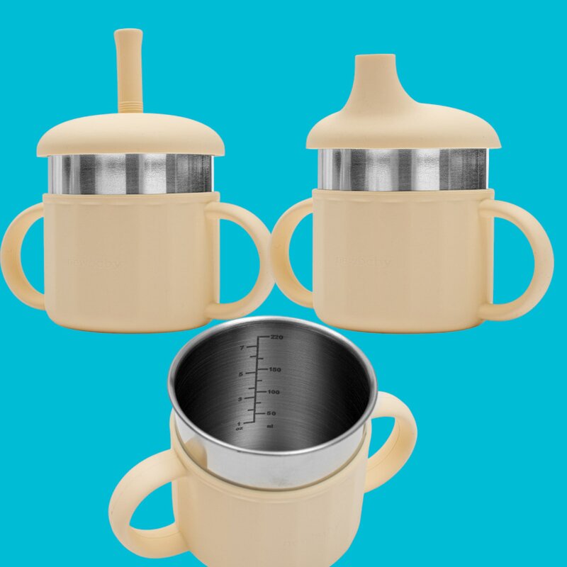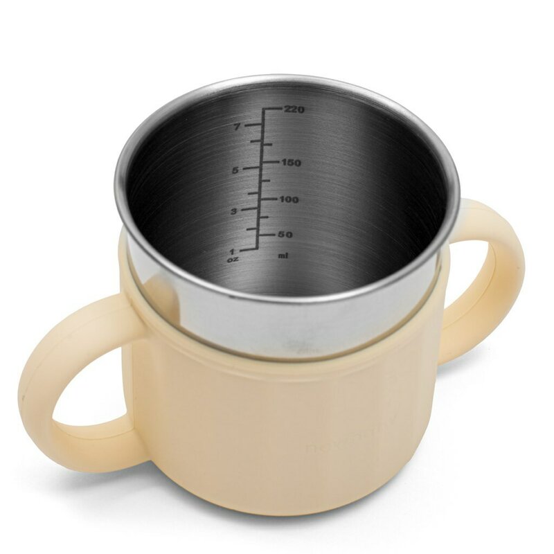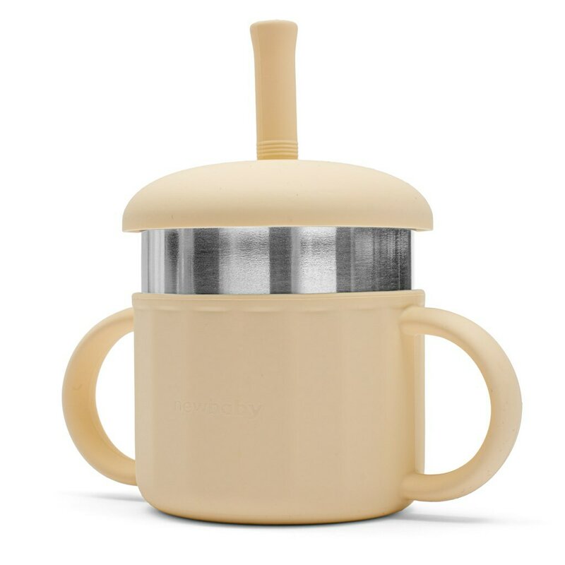 Canuta, New Baby, Cu manere si gura de scurgere care poate fi folosita de sine statatoare sau cu pai, 50% silicon, 50% otel inoxidabil, Fara BPA, 0 luni+, Beige
