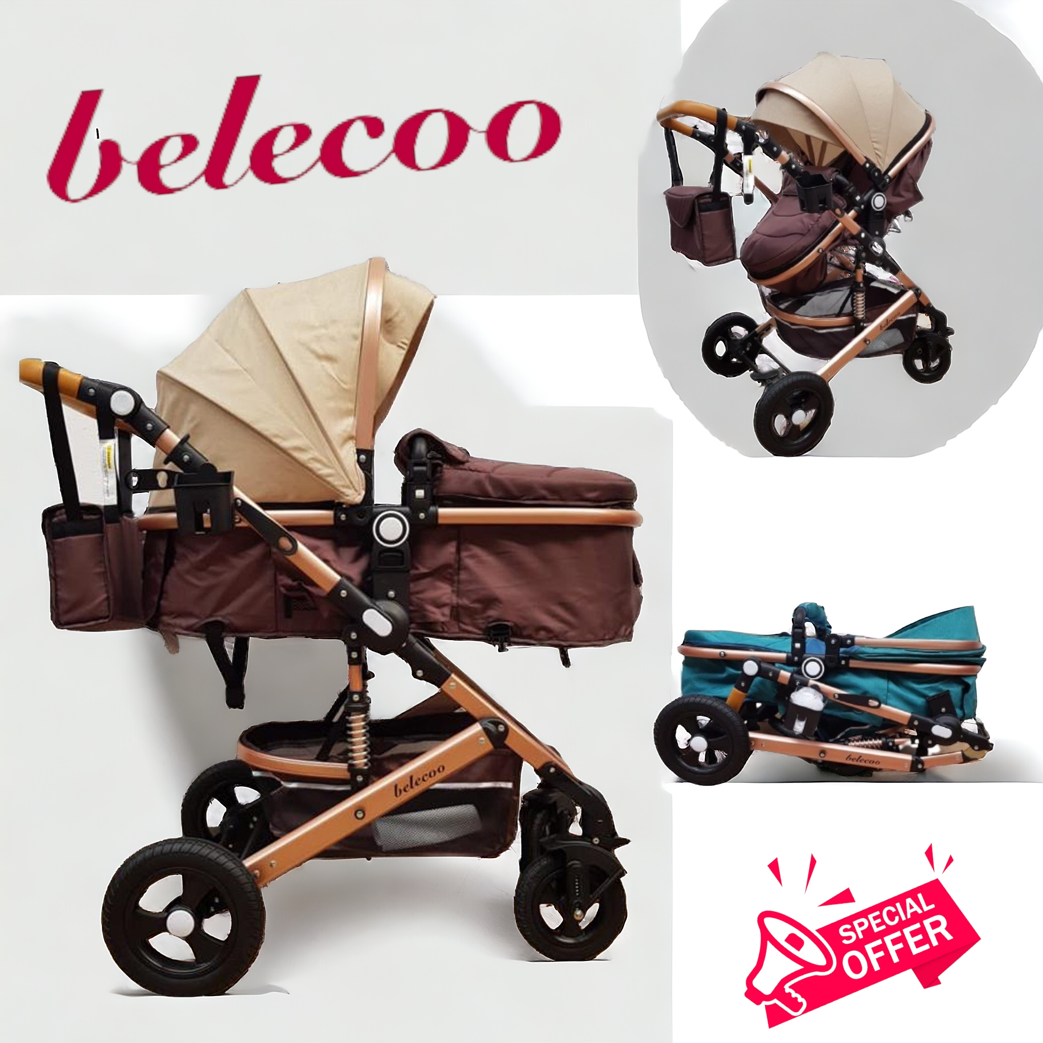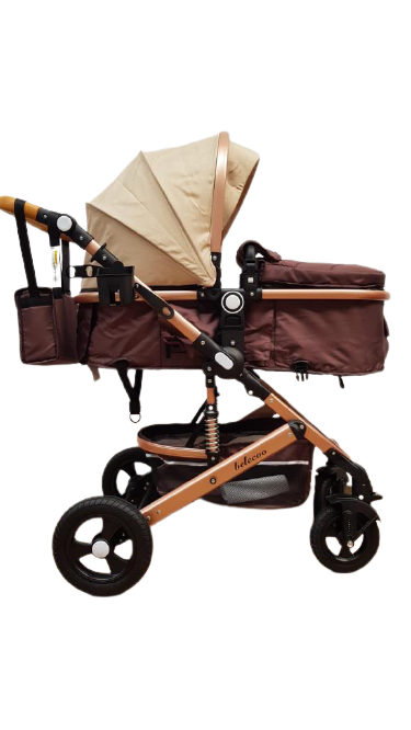 Carucior Belecoo , model 2 in 1 cu suspensii si roti cauciuc plin ,recomandat 0-36 luni, culoare bej/maro , BBDBLCBM