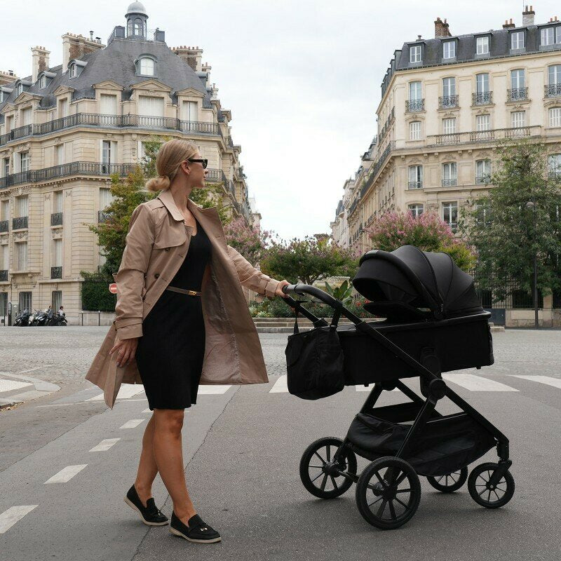 Caruciorul are un design elegant, fara a compromite practicitatea. Caracteristicile functionale includ carlige pentru geanta pe manerul caruciorului, un organizator cu fermoar la cos, un suport pentru pahar si un fermoar dublu pe husa landoului. Culorile atent coordonate si brandul discret creeaza o impresie generala de eleganta rafinata.