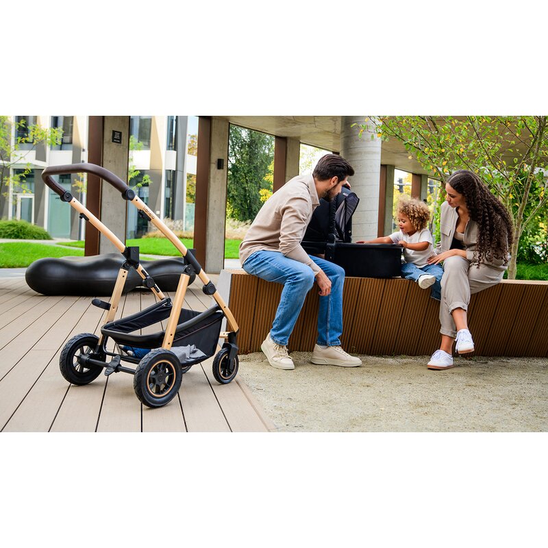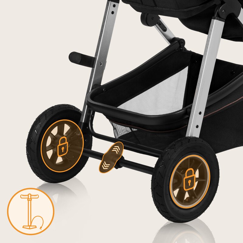 - Caruciorul are ronti gonflabile si un dispozitiv de blocare a directiei pentru inainte. Amber 3 in 1 ofera o amortiare a socurilor rotilor din fata si din spate, precum si reglarea manerului pentru o directie mai usoara.