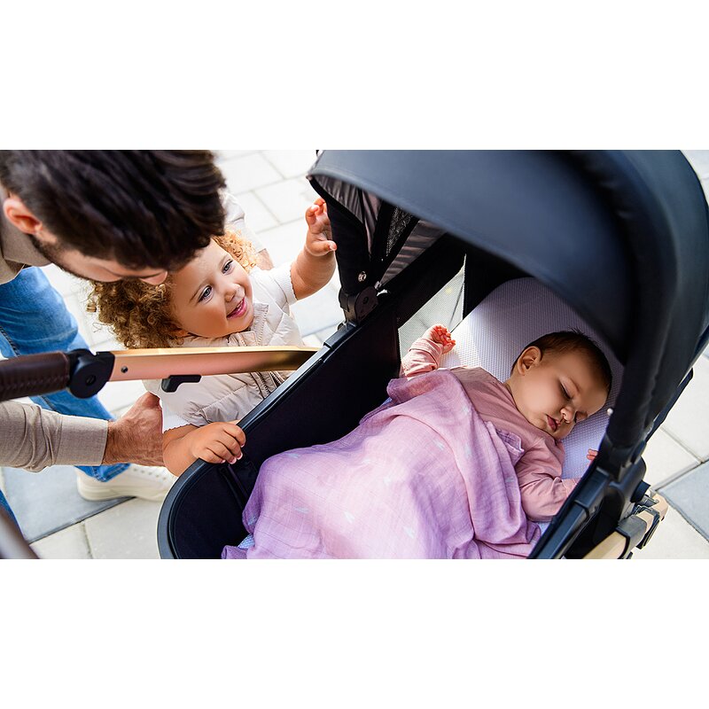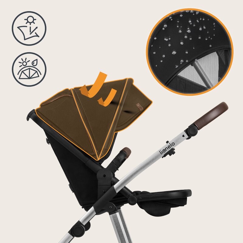 - Lionelo Amber 3 in 1 are o gama larga de accesorii, cum ar fi plasa de tantari universala si pelerina de ploaie, saculet pentru picioare, precum si saltea de infasat si o geanta practica montabila pe maner.