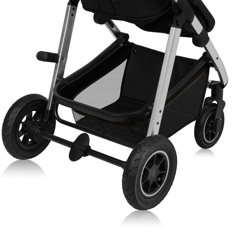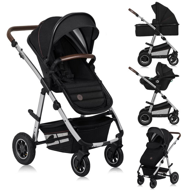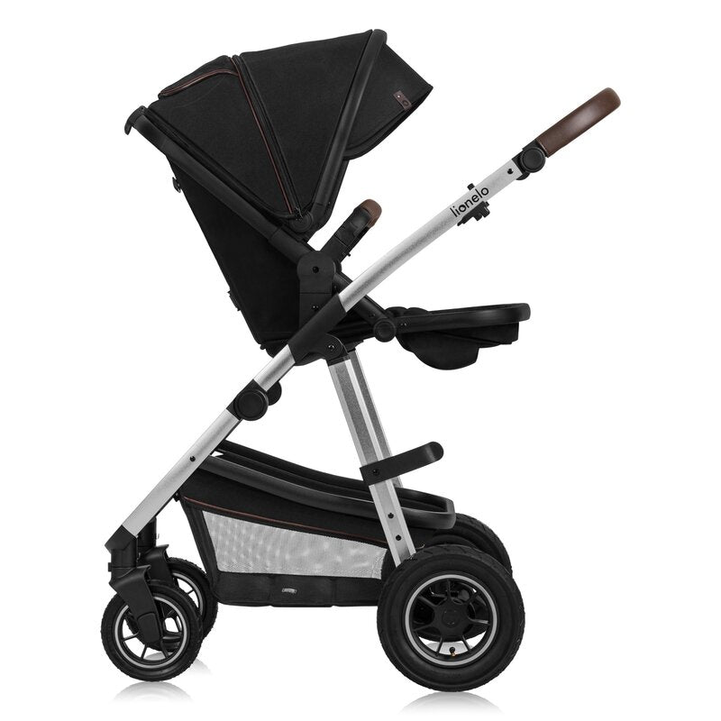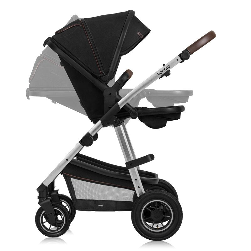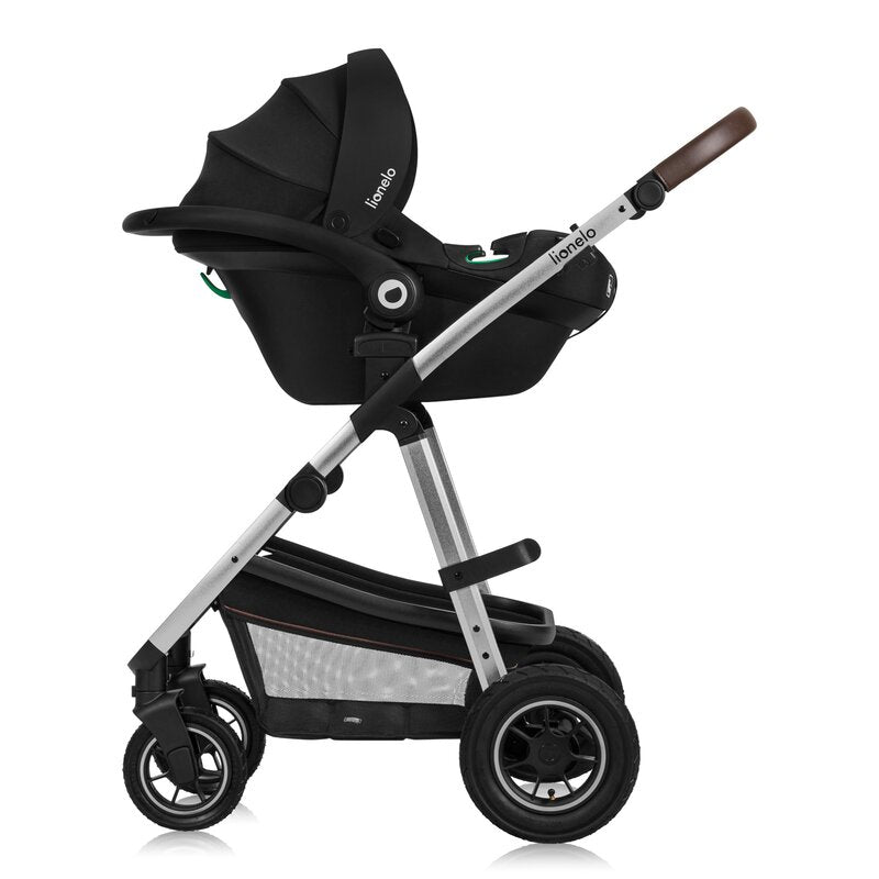 Carucior 3 in 1, Lionelo, Amber, Cadru aluminiu, Cu landou intarit si salteluta moale, Cu scoica auto testata ADAC, Reversibil, Cu accesorii, Geanta parinti, Pana la 22 kg, Negru silver