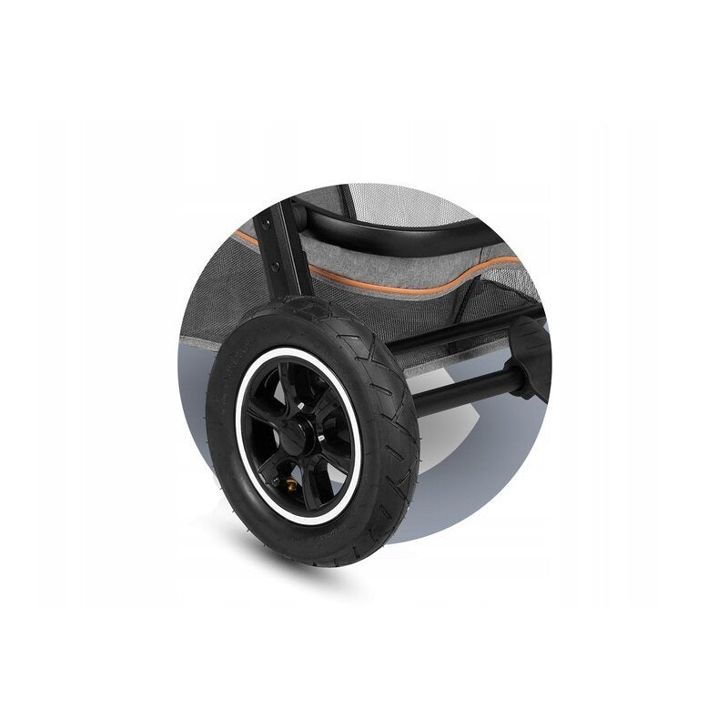 Rotile gonflabile si sistemul performant de amortizare frontala si spate garanteaza o deplasare lina si confortabila pentru copil. Manerul reglabil si frana centrala ofera parintilor un control deplin asupra caruciorului in orice moment.