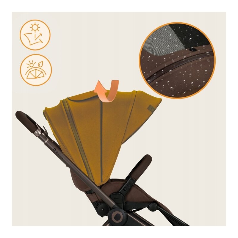 Atat landoul, cat si caruciorul sunt dotate cu o copertina cu protectie solara UPF50+ si un strat impermeabil. Copertina generoasa protejeaza copilul atat de elementele naturii, cat si de suprastimulare, creand un mediu calm si confortabil. Un panou de ventilatie rabatabil in parasolarul caruciorului, impreuna cu un sistem de ventilatie in copertina, asigura confortul in orice vreme.