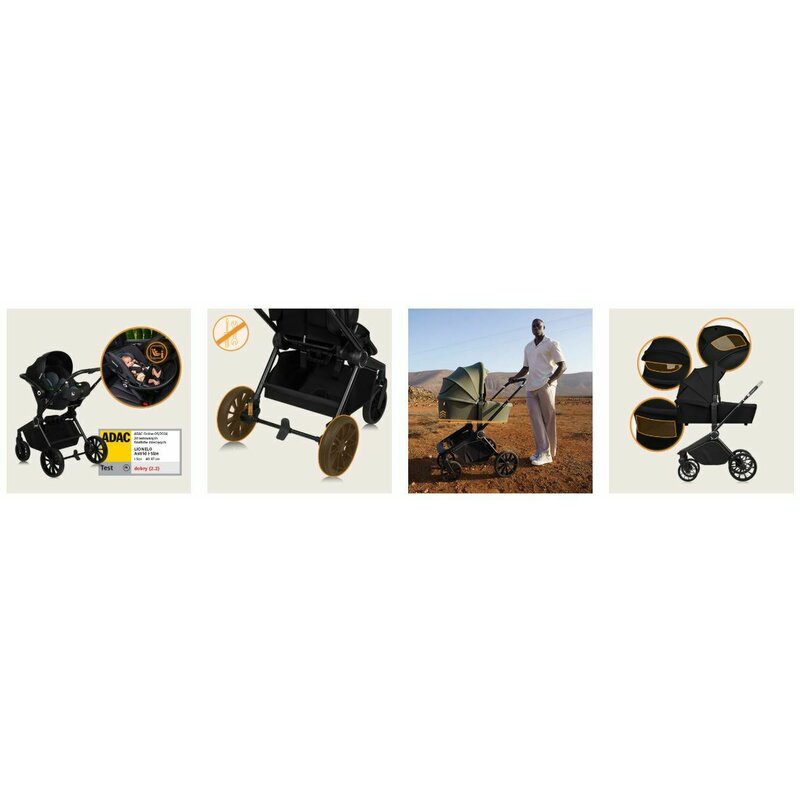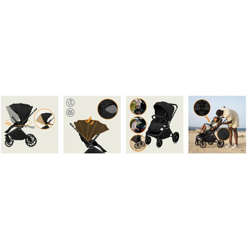 Husa caruciorului, fabricata cu un continut ridicat de elastan, ramane neteda si fara cute, in timp ce tesatura premium asigura durabilitate indelungata chiar si in conditii meteo dure. Hamul are o catarama magnetica pentru o fixare rapida si usoara, iar adaptoarele incluse permit ajustarea inaltimii landoului pentru a se potrivi nevoilor parintilor.