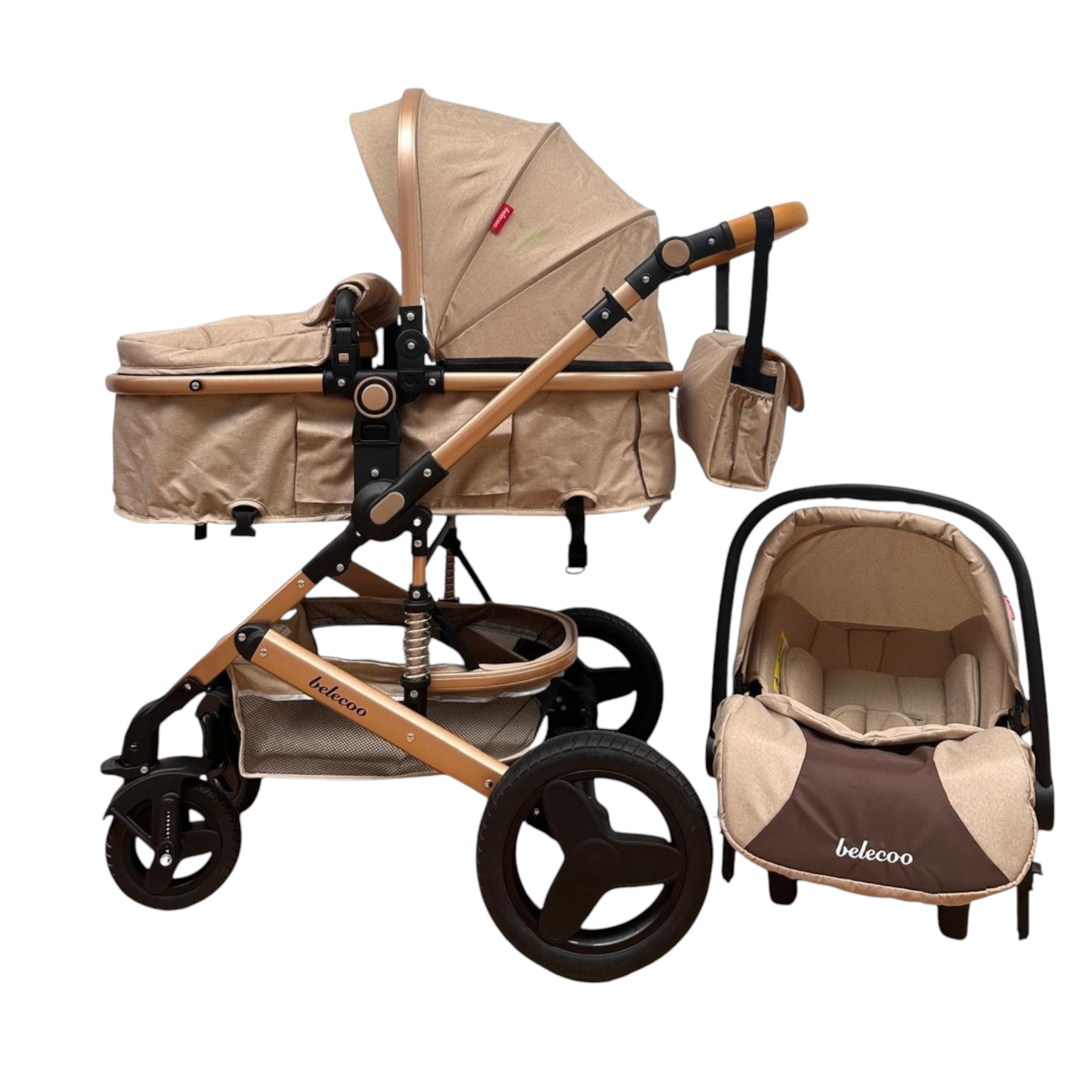 Carucior Belecoo 3 in 1 cu suspensii si roti cauciuc plin, reversibil, accesorizat culoare Crem , BBD530WT