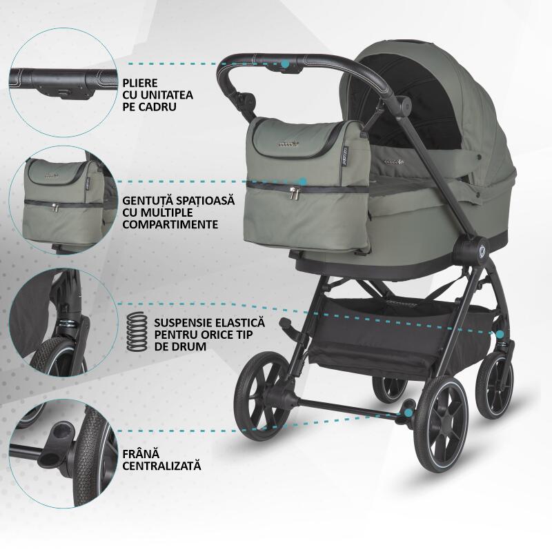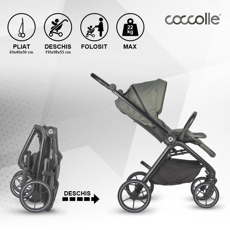 Coccolle Serry 3 în 1 – sistemul complet pentru mobilitatea modernă a familiei taleCu un design rafinat și funcționalități premium, Coccolle Serry 3 în 1 este alegerea perfectă pentru părinții care își doresc un cărucior modular versatil, elegant și sigur. Acest sistem complet include landou, unitate sport și scoica auto Coccolle Knox i-Size, astfel încât să fii pregătit(ă) pentru fiecare etapă din viața copilului, de la primele zile de viață și până la vârsta de 4 ani.Confort absolut încă din prima ziLandoul Coccolle Serry este generos, bine ventilat și dotat cu o copertină înaltă și parasolar pliabil, ideal pentru somnul liniștit al nou-născutului. Materialele premium și detaliile elegante – precum pielea ecologică neagră cu logo Coccolle în relief – fac din fiecare plimbare o experiență premium.Unitatea sport se adaptează perfect etapelor de creștere, având spătar și suport de picioare reglabile independent, husă de picioare inclusă și copertină XXL extensibilă cu protecție UV50+. Centura magnetică în 5 puncte face fixarea copilului rapidă, intuitivă și sigură.Mobilitate fără griji cu Scoica Auto Coccolle Knox i-SizeScoica Coccolle Knox i-Size (0-13 kg, până la 75 cm) aduce un plus de siguranță sistemului 3 în 1. Conformă cu standardul european R129, scoica oferă protecție laterală avansată, poziție ergonomică și instalare rapidă fie cu centura mașinii, fie pe baza Isofix (compatibilă, achiziționată separat).Designul Knox este gândit pentru siguranță și confort maxim, cu tetieră reglabilă pe înălțime, inserții moi pentru nou-născuți și copertină proprie cu protecție UV.Un singur sistem, toate accesoriile de care ai nevoieCoccolle Serry 3 în 1 vine cu un set complet de accesorii incluse: husă de picioare, husă de ploaie, plasă de insecte, geantă pentru mămici, adaptoare pentru scoica auto, pad suplimentar pentru unitatea sport. Tot ce îți trebuie pentru plimbări sigure și confortabile este deja în cutie.Culori sofisticate și stil urbanDisponibil în variante moderne – Jet Black, Light Taupe sau Moss Green – Coccolle Serry se potrivește oricărui stil, aducând un plus de eleganță și personalitate fiecărei ieșiri.De ce să alegi Coccolle Serry 3 în 1 cu Scoica Knox?✔️ Siguranță completă, conformă i-Size✔️ Design premium și materiale de calitate✔️ Versatilitate maximă: de la naștere până la 4 ani✔️ Accesorii incluse pentru confortul zilnic✔️ Manevrabilitate excelentă pe orice teren👉 Alege Coccolle Serry 3 în 1 cu scoica Knox și oferă-i copilului tău siguranță, confort și stil la fiecare pas! *Imaginile prezentate pe site sunt realizate in studio profesional, astfel nuanta culorii produselor poate fi diferita in functie de luminozitatea din jurul produsului. De asemenea, in functie de setarile fiecarui dispozitiv (telefon, laptop, Pc) care afiseaza site-ul, culoarea produsului poate sa difere.