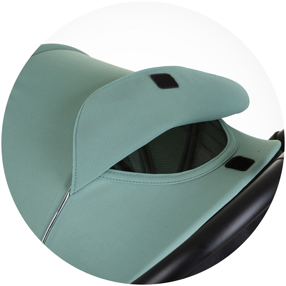 - Copertina generoasa si reglabila, dotata cu vizor si realizata din material impermeabil