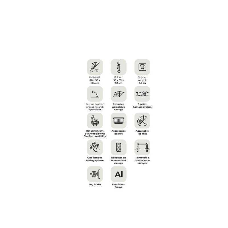 - Caruciorul este finisat cu bara de impingere din piele ecologica.