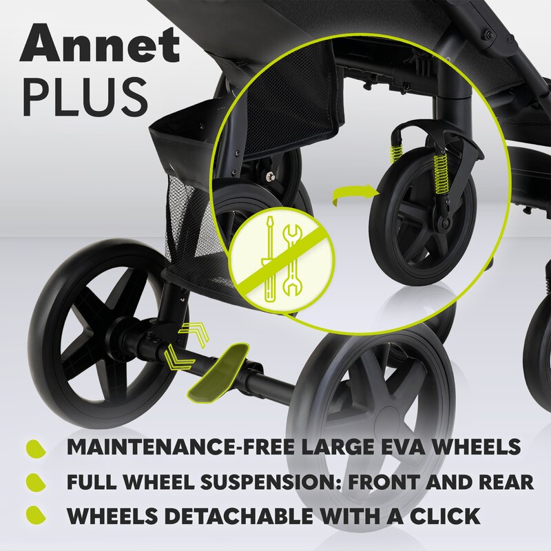 Caruciorul va permite sa reglati spatarul si suportul pentru picioare pentru un confort imbunatatit si sa adaptati pozitia produsului la nevoile copilului. Un cadru usor si durabil, precum si un sezut spatios va permit sa utilizati produsul pana cand copilul dumneavoastra cantareste 22 kg. Cand este pliat, Annet Plus devine compact si puteti detasa rotile montate click de pe cadru.