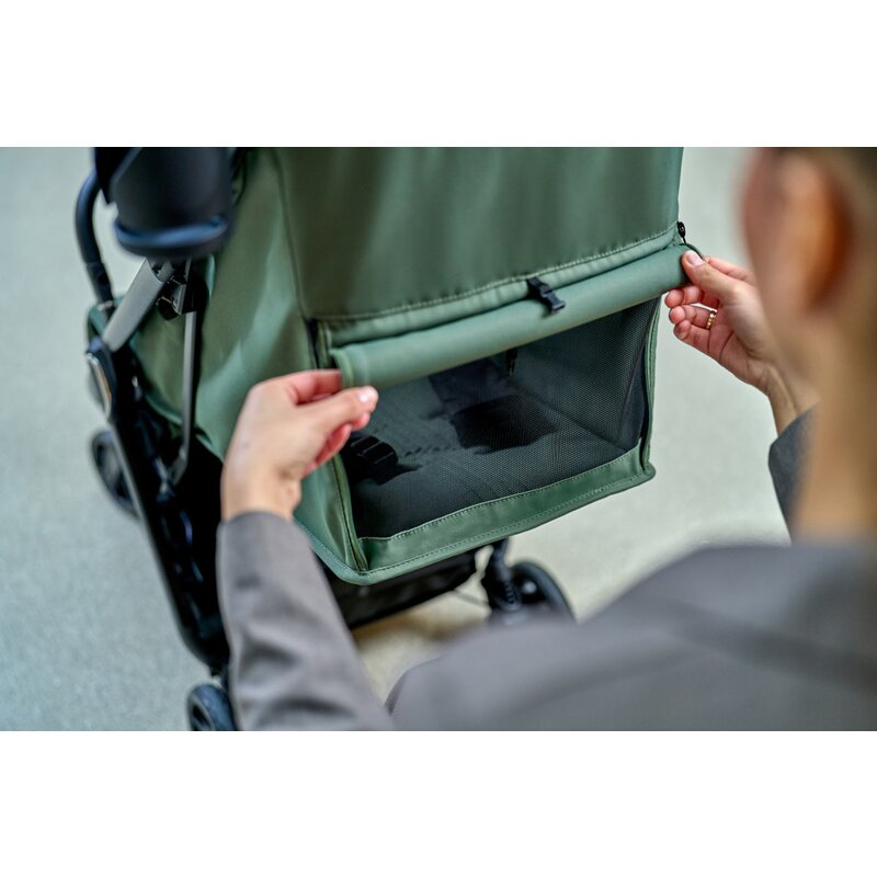 Bess se pliaza automat printr-o simpla miscare – apasa butonul si se strange singur. Dupa pliere, ramane stabil in pozitie verticala si tapiteria nu atinge solul. Include si o curea de umar pentru transport facil.