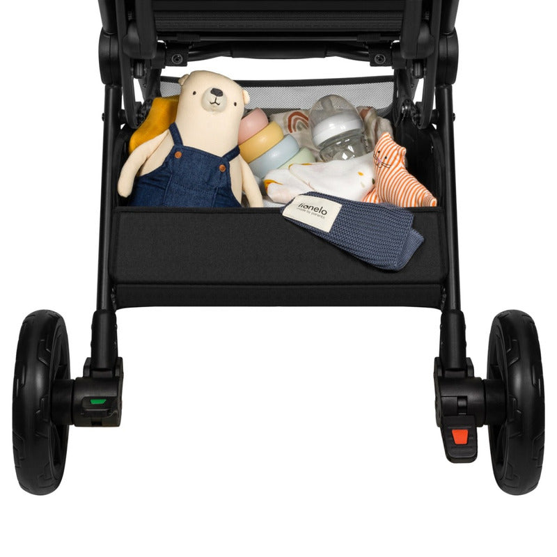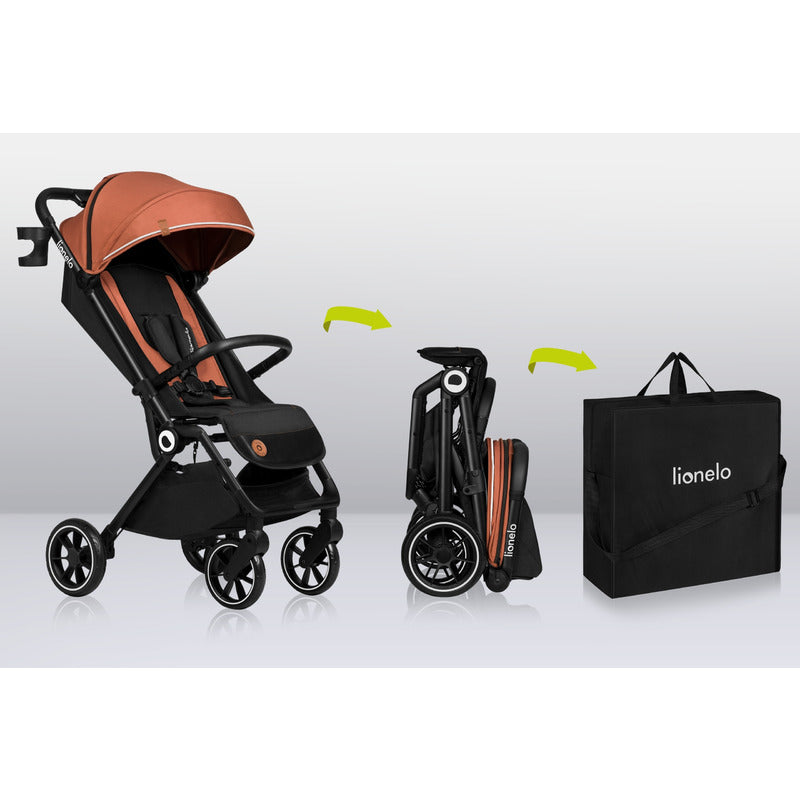 - Caruciorul Lionelo Cloe poate fi pliat cu usurinta cu o singura mana . Puteti folosi si sistemul de pliere automata - dupa apasarea butonului, caruciorul se va plia singur. Il poti pune cu usurinta chiar si intr-un portbagaj mic. Cadrul durabil din aluminiu cantareste doar 8,2 kg. Puteti purta cu usurinta caruciorul peste umar. Avand in vedere acest lucru, am inclus o husa speciala si o curea in set.