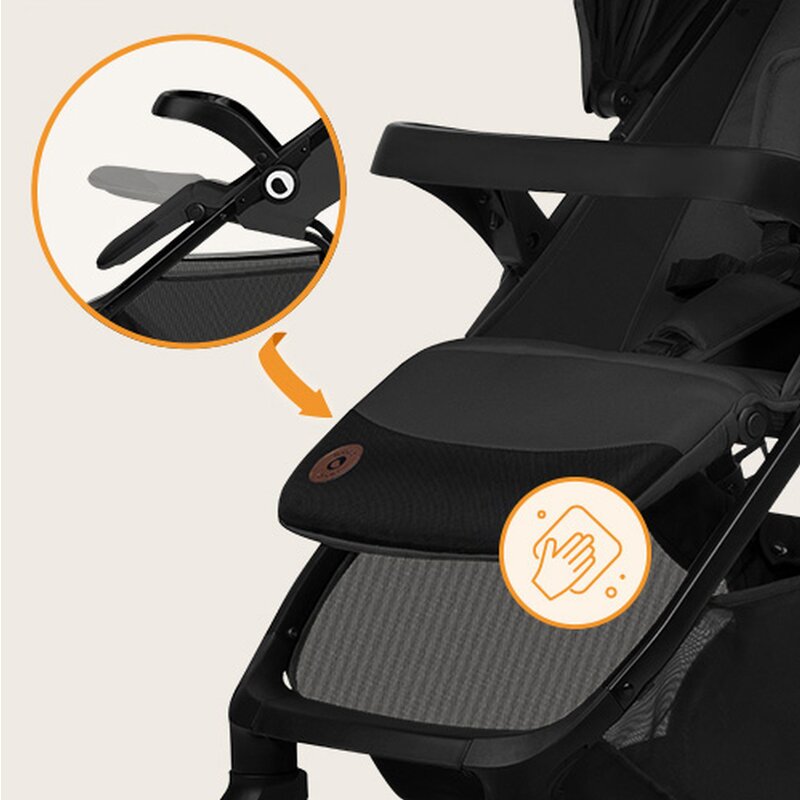 Pentru un plus de confort, suportul pentru picioare este reglabil in doua trepte. De asemenea, zona dedicata pentru pantofi protejeaza tapiteria caruciorului de murdarie.