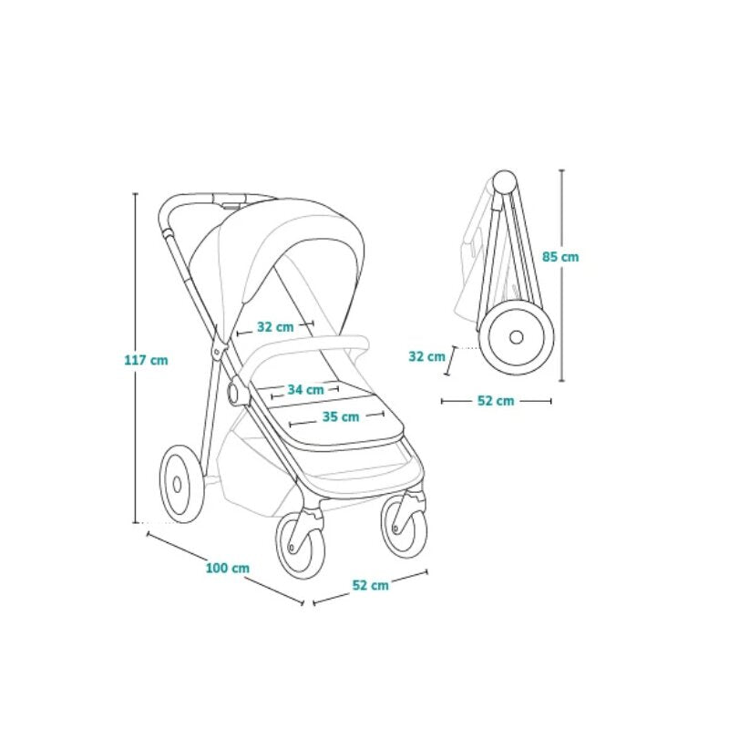Caruciorul se pliaza rapid cu o singura mana, ramanand intr-o pozitie verticala pentru depozitare facila. Cu o greutate de doar 9,6 kg, transportul devine foarte usor.