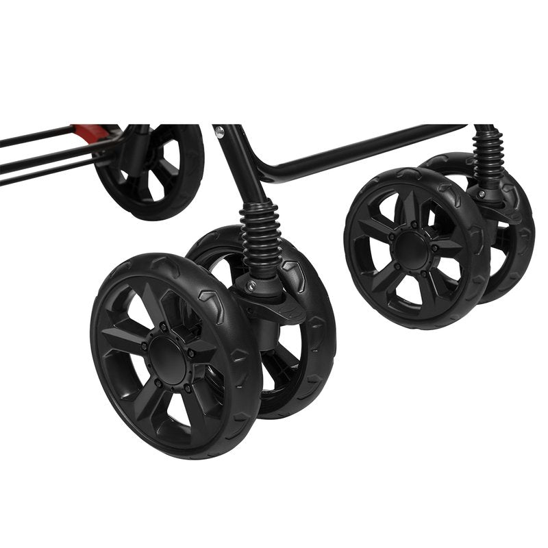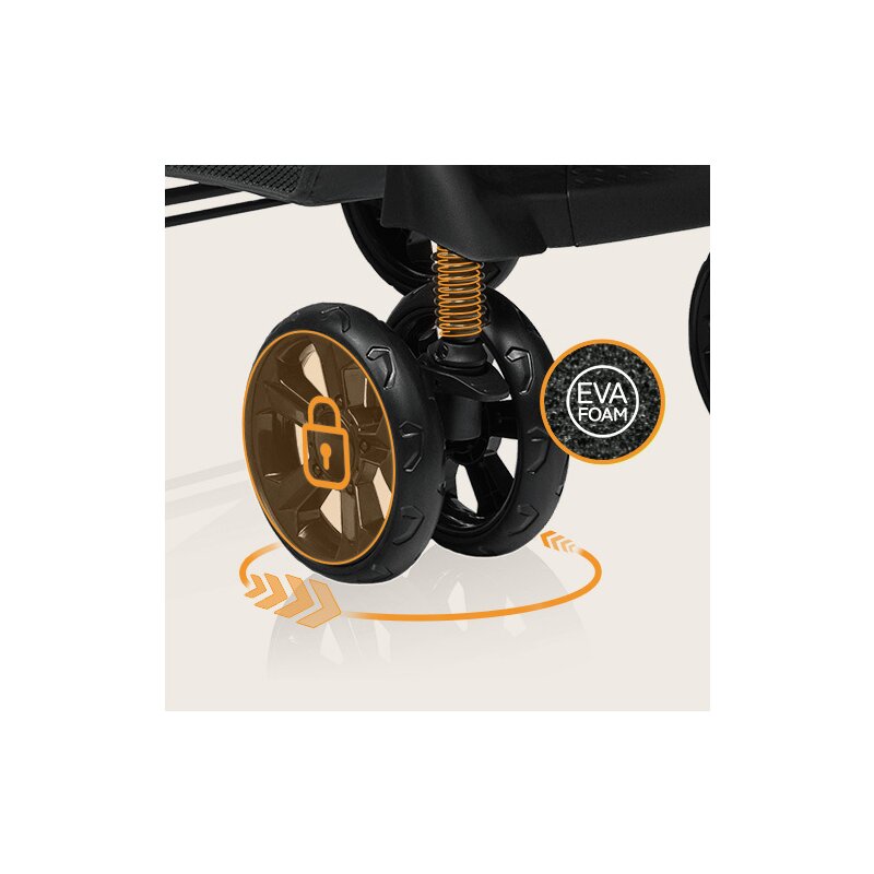 Stabile si manevrabile - rotile din spuma EVA durabila se descurca pe orice drum. Cu ajutorul lor, vei merge usor pe pavaj sau pe o trotuar neuniform. La rotile din fata vei gasi un blocator practic - utilizeaza-l pentru a stabiliza caruciorul pe denivelari. Amortizarea moale va asigura confortul copilului.