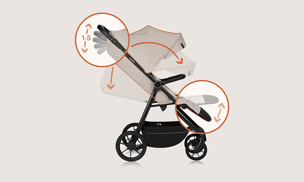 Spătarul și suportul pentru picioare pot fi reglate. Când copilul este mai mare, în loc să stea pe un suport pentru picioare, își poate odihni picioarele pe un suport suplimentar.