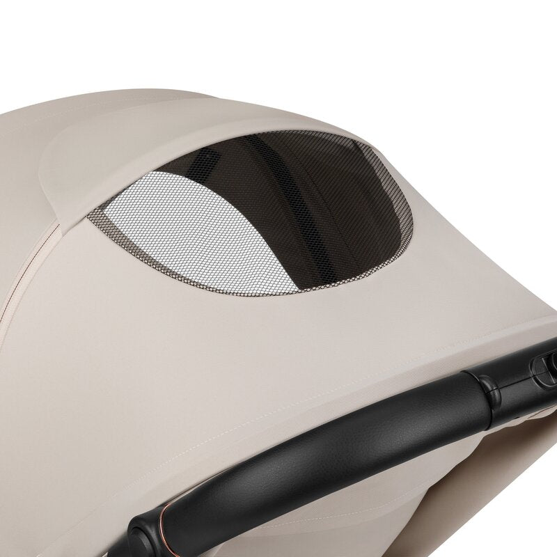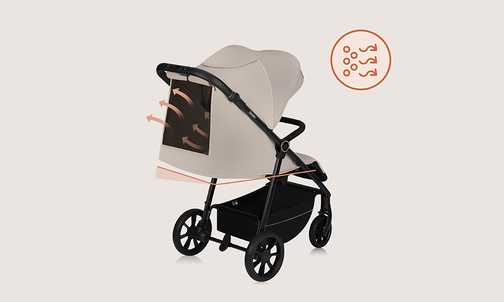 Capotina XXL oferă suficient spațiu pentru un copil. Are un panou retractabil suplimentar, o fereastră pentru un flux de aer mai bun.