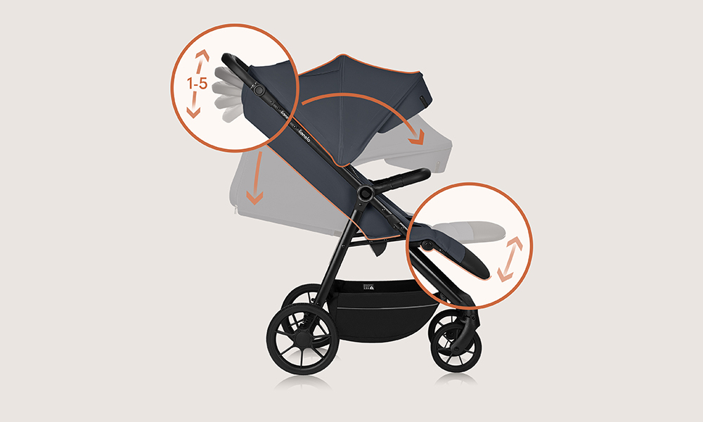 Spătarul și suportul pentru picioare pot fi reglate. Când copilul este mai mare, în loc să stea pe un suport pentru picioare, își poate odihni picioarele pe un suport suplimentar.
