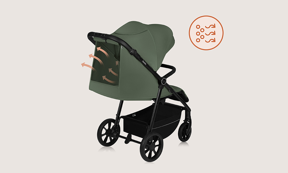 Panoul de ventilație din spatele spătarului poate fi deschis atunci când copilul doarme într-o poziție culcată. De asemenea, va circula aer curat în timp ce doarme.