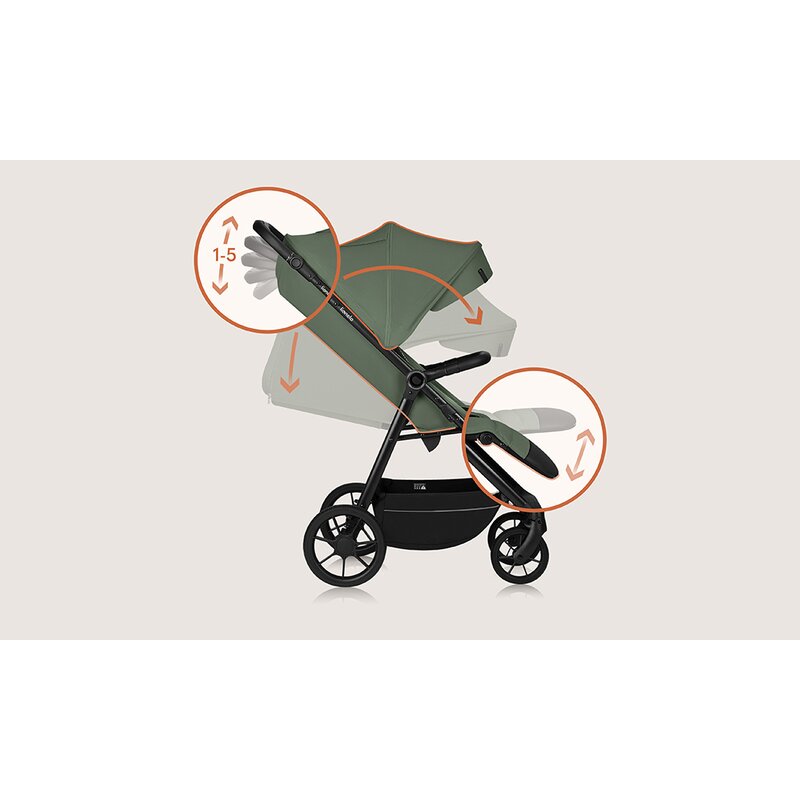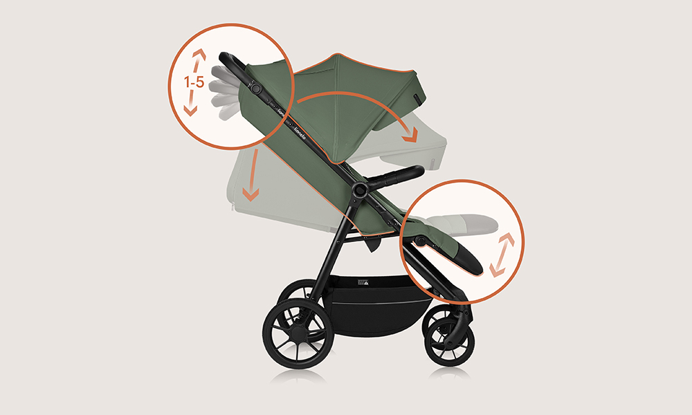Spătarul și suportul pentru picioare pot fi reglate. Când copilul este mai mare, în loc să stea pe un suport pentru picioare, își poate odihni picioarele pe un suport suplimentar.
