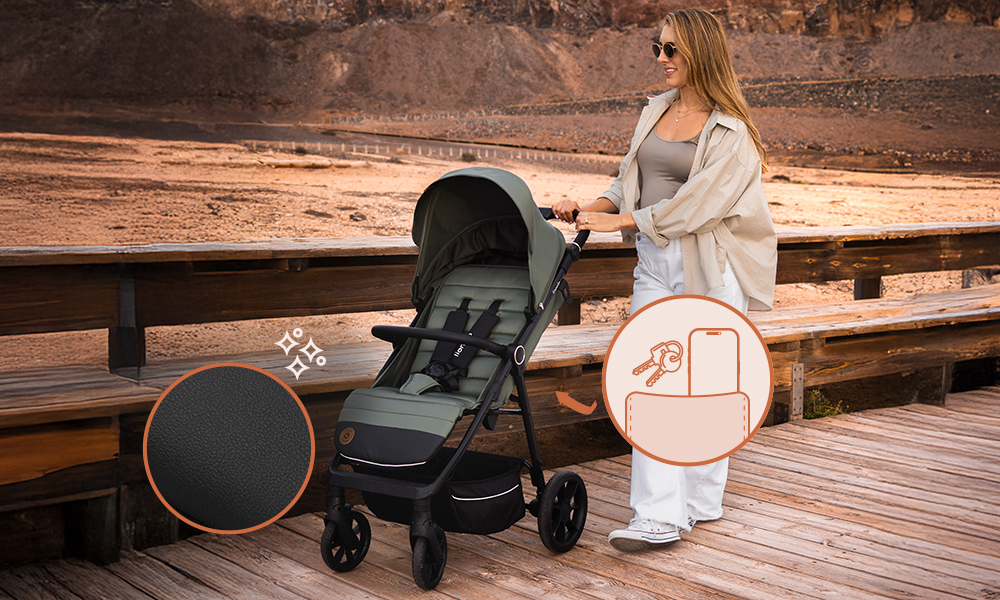 Țesăturile folosite la cărucior sunt materiale premium atent selectate. De asemenea, a fost acordată atenție detaliilor, de exemplu, mânerul este acoperit cu piele ecologică elegantă.