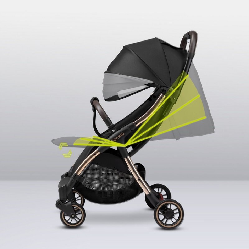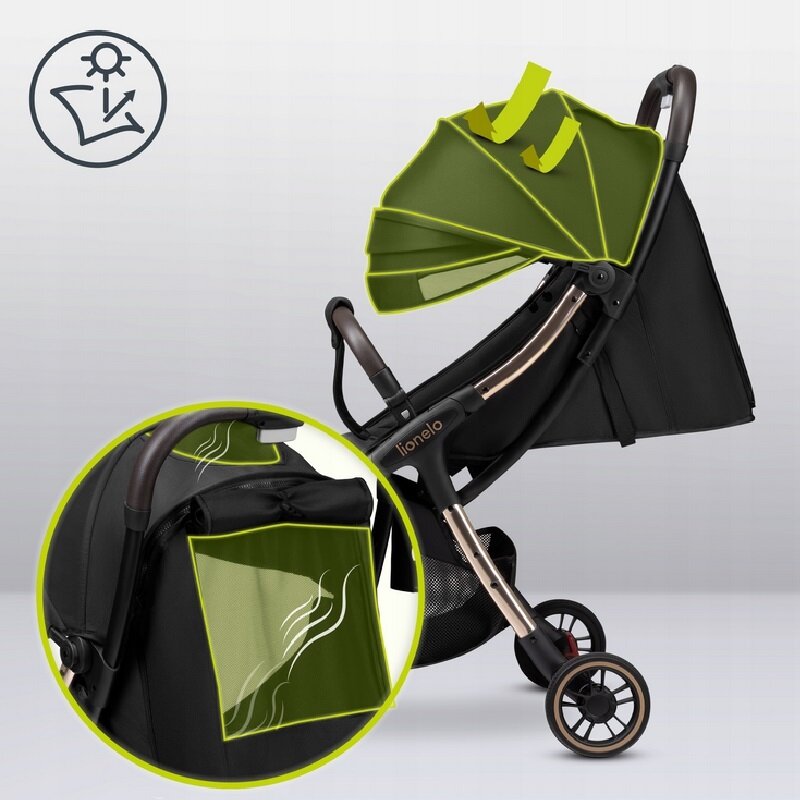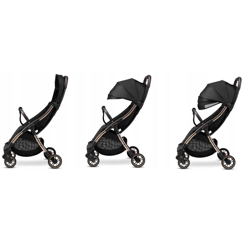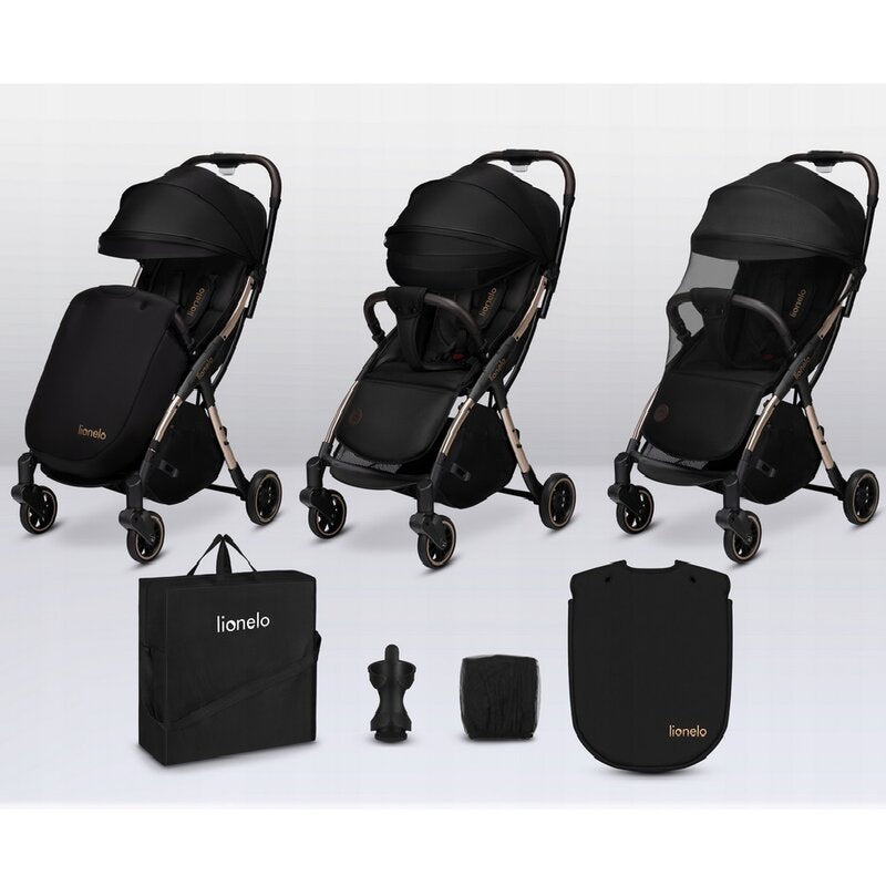 Carucior sport, Lionelo, Julie One, De la nastere, Greutate redusa, Cu accesorii, Cadru din aluminiu, 0-22 kg, Pliere compacta pentru avion, Conform cu standardele europene de securitate EN1888-1 si EN1888-2, Negru/Auriu