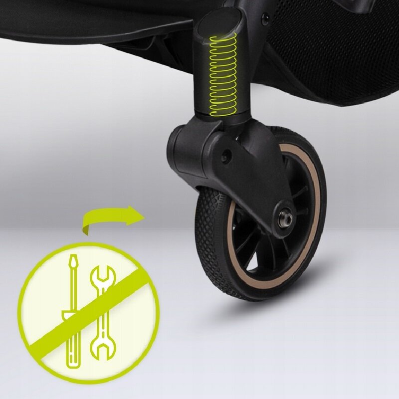 Caruciorul Lionelo Julie One este echipat cu roti fara intretinere cu acoperire de cauciuc PU, care se descurca pe orice drum. Amortizarea fata si spate elimina socurile neplacute pe suprafete neuniforme, iar frana de picior securizeaza pozitia caruciorului in timpul opririi.
