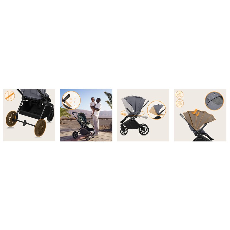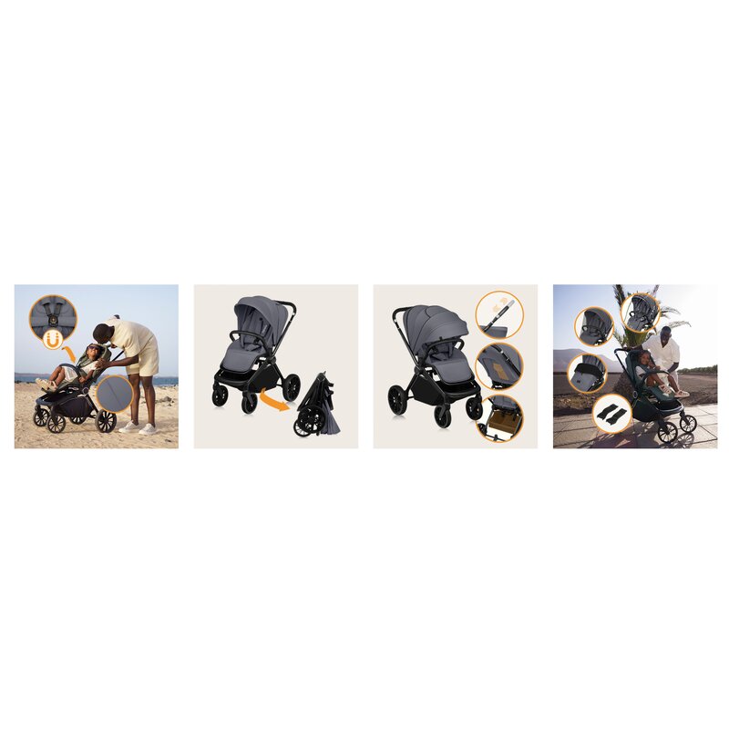 Setul include o plasa pentru tantari, o husa pentru picioare, o curea de transport si o husa de ploaie, pentru a asigura confort si comoditate in timpul plimbarilor, indiferent de vreme. Sunt disponibile, de asemenea, adaptoare pentru scaun auto (vandute separat), care permit atasarea usoara a acestuia la cadrul caruciorului.