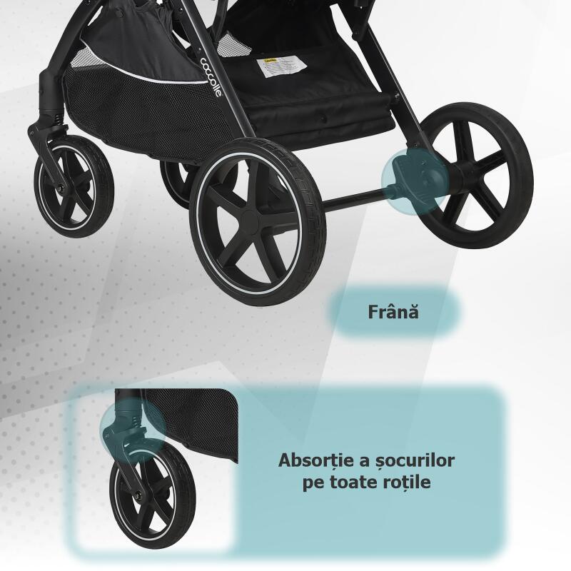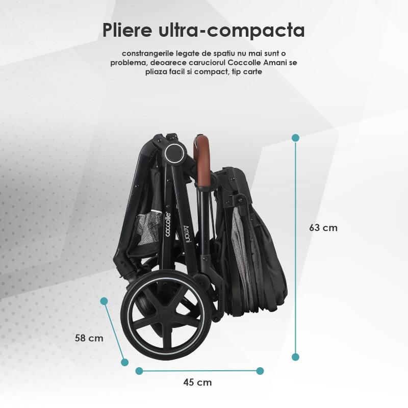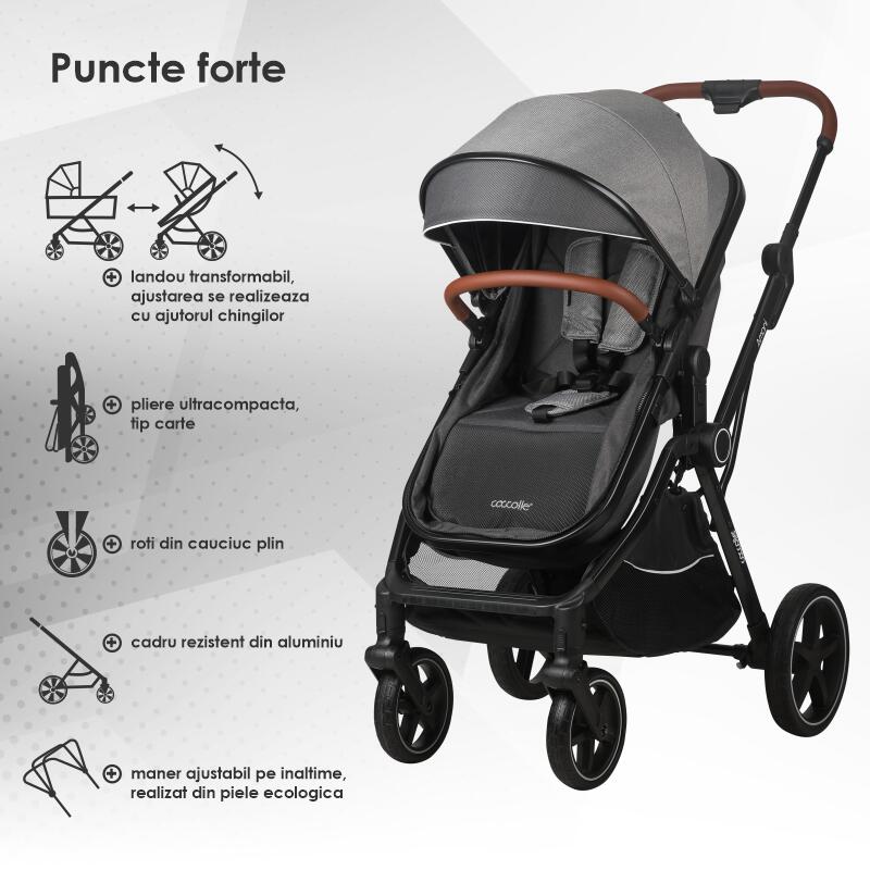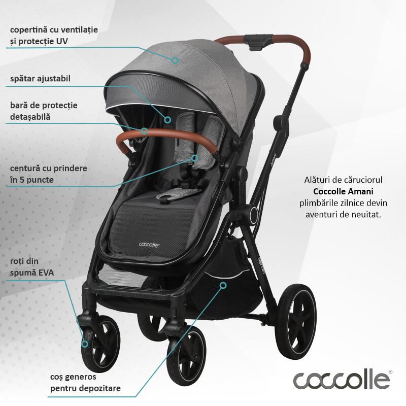 Viata alaturi de un nou nascut devine mai usoara atunci cand ai caruciorul potrivit. Coccolle Amani vine in intampinarea parintilor in viata carora spatiul este o problema intrucat este echipat cu un cadru ce se pliaza compact si un landou transformabil.Caruciorul Amani poate fi folosit de la 0 luni deoarece este echipat cu o unitate transformabila care se poate transforma foarte simplu si intuitiv intr-un landou confortabil, accesorizat perfect cu o salteluta moale si sigura pentru bebelusi. Dupa perioada de nou-nascut, atunci cand cel mic este capabil sa se ridice se poate opta pentru utilizarea ca si unitate sport.Prin prinderea rapida a catorva chingi si barete se obtine in scurt timp o unitate sport incapatoare si sigura, dotata cu centura de siguranta in 5 puncte.Rotile din cauciuc plin ofera o plimbare lina, lipsita de evenimente care ar putea deranja odihna celui mic sau care l-ar putea opri din contemplarea mediului inconjurator.Suspensiile rotilor din fata contribuie si ele semnificativ la placerea plimbarii. Chiar daca pare un produs simplu, Coccolle Amani este un sistem modular complex bine echipat pentru toate anotimpurile si pentru toate timpurile de iesiri.Ca accesorii, setul cuprinde husa de picioare calduroasa care il apara pe cel mic de intemperiile din toamna si iarna, husa impotriva insectelor este perfecta vara cand fiecare iesire poate provoca intepaturi neplacute, iar husa de ploaie protejeaza copilul atunci cand vremea devine capricioasa.Copertina XXL acopera perfect copilul, prevenind efectul nociv al radiatiilor solare, iar fereastra de ventilatie este perfecta pentru prevenirea supra-incalzirii.Scoica auto din dotare se potriveste atat pe cadru (cu ajutorul adaptorilor inclusi) cat si in masina, fiind perfecta atunci cand aveti de realizat comisioane rapide ce nu dureaza ore in sir.Materialele de calitate din care este fabricat caruciorul sporesc experienta placuta intrucat componentele textile sunt moi si placute la atingere, dar rezistente la praf si utilizare indelungata, in timp ce componentele metalice sunt realizate din aluminiu, un element usor, dar in acelasi timp rezistent. Micile accente de piele ecologica confera produsului o eleganta aparte, iar multumita cosului de cumparaturi generos va asigurati ca nu lipseste nimic din arsenalul necesar fiecarei plimbari cu un pui de om.Caracteristici principale:-cadru de aluminiu solid si rezistent, dar usor de manevrat si pliat;-pliere compacta, chiar si cu unitatea sport pe cadru-unitate transformabila practic, ce poate fi modificata din landou in unitate spor usor cu ajutorul unor chingi- roti din cauciuc plin, cu suspensie fata-accesorii: husa de picioare, husa de ploaie, salteluta landou, plasa de insecte-centura de siguranta in 5 puncte-copertina XXL cu fereastra de ventilatie-scoica auto certificata i size, utilizabila pana la 13 kg, cu adaptori pentru cadru inclusi; tetiera reglabila; se monteaza in autoturism DOAR cu spatele la sensul de mers cu ajutorul centurii masinii.