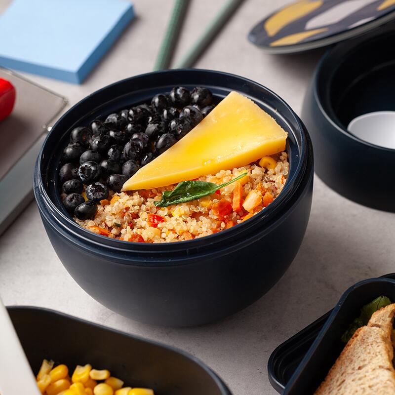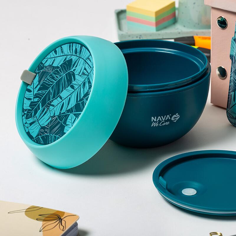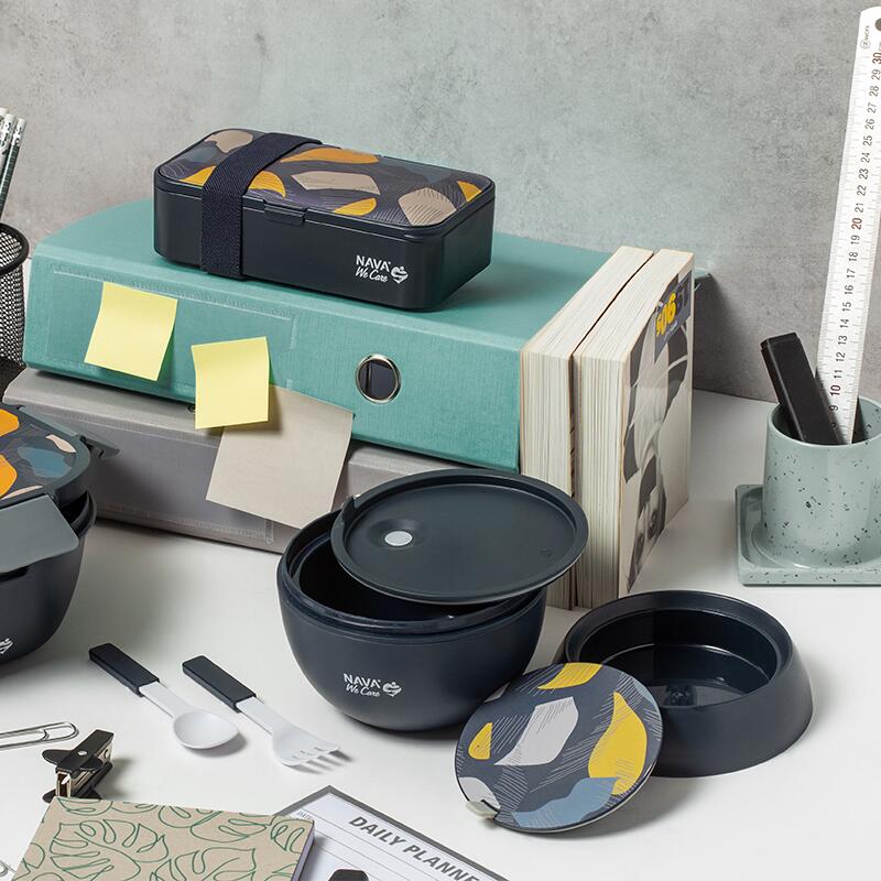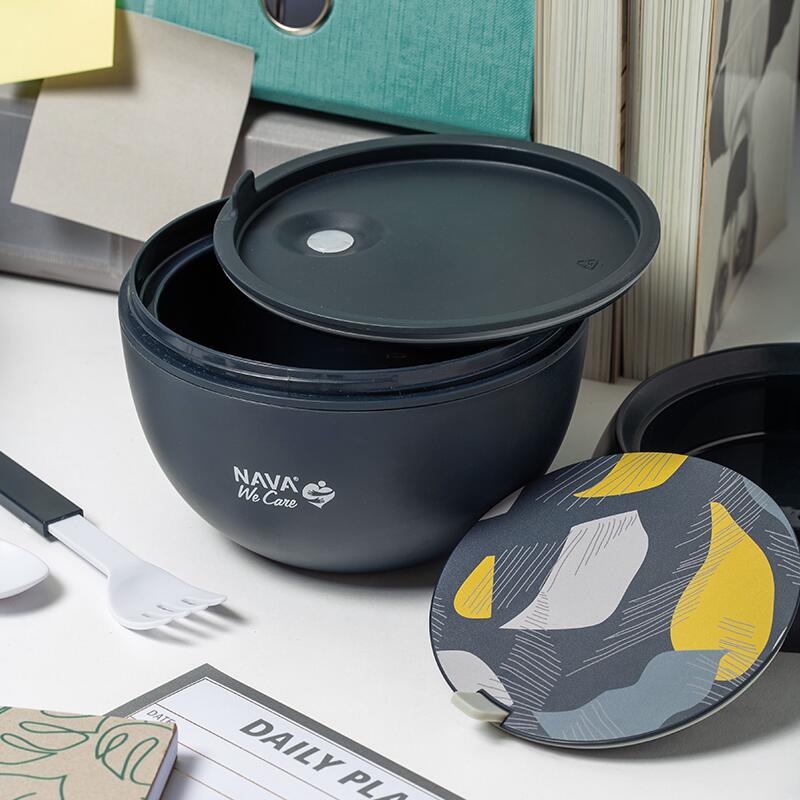 Recipientul rotund pentru alimente "We Care" de 800 ml de la Nava, cu lingura si furculita integrate in capac, este recipientul ideal pentru transportul si depozitarea alimentelor. Este realizat din plastic de înaltă calitate, fără BPA, PVC, ftalați și alte elemente nocive și complet sigur pentru depozitarea igienică a alimentelor. În capacul cu infiletare veți găsi o lingură și o furculiță pliabila pentru a vă bucura de mâncare în orice moment. Capacul cu filet poate fi folosit și ca al doilea spațiu de depozitare sau ca topper. Recipientul are in plus propriul capac cu un inel de silicon care se inchide ermetic si este echipat cu un capac pentru ventilatie si decongestionare a vaporilor de apa pentru alimentele fierbinti pe care le depozitezi. Perfect pentru școală, serviciu și excursii sau oriunde ți se potrivește. Este rezistent la temperaturi cuprinse intre -20°C si 20°C. "We care" este o gama de caserole pentru alimente fabricate conform reglementărilor pentru produsele ce intra în contact cu alimentele. Sunt alegerea sănătoasă, perfectă pentru depozitarea alimentelor. Produsul se poate spăla în mașina de spălat vase. Potrivit pentru congelare. Nu este potrivit pentru cuptorul cu microunde.