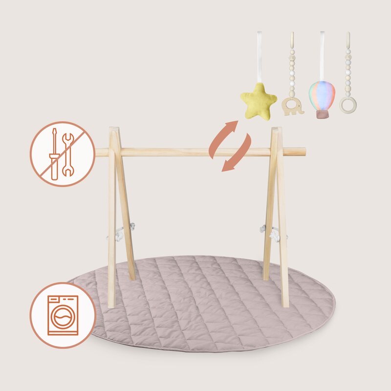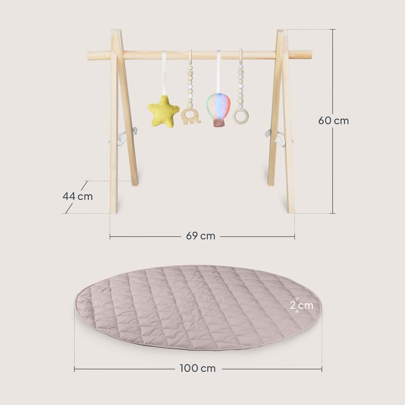 Structura si jucariile suspendate sunt realizate din lemn natural de pin, iar salteluta din bumbac moale si respirabil este delicata cu pielea sensibila a bebelusului, oferind confort optim in timpul jocului.