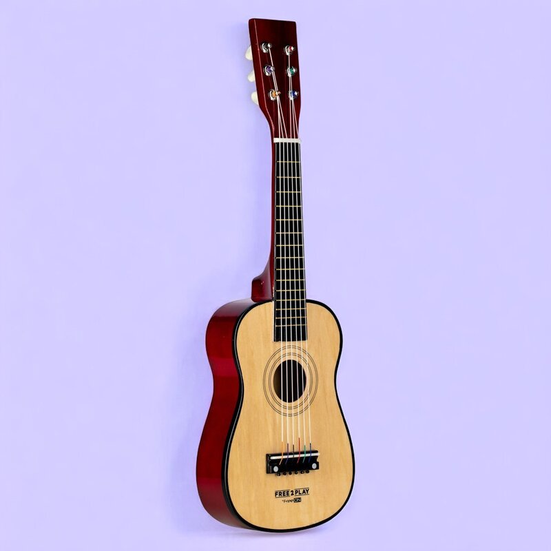 Chitara din lemn, Free2Play, Cu 6 corzi metalice, Dezvolta abilitatile motorii, Stimuleaza auzul si atentia auditiva, 59 cm, 3 ani+, Brown