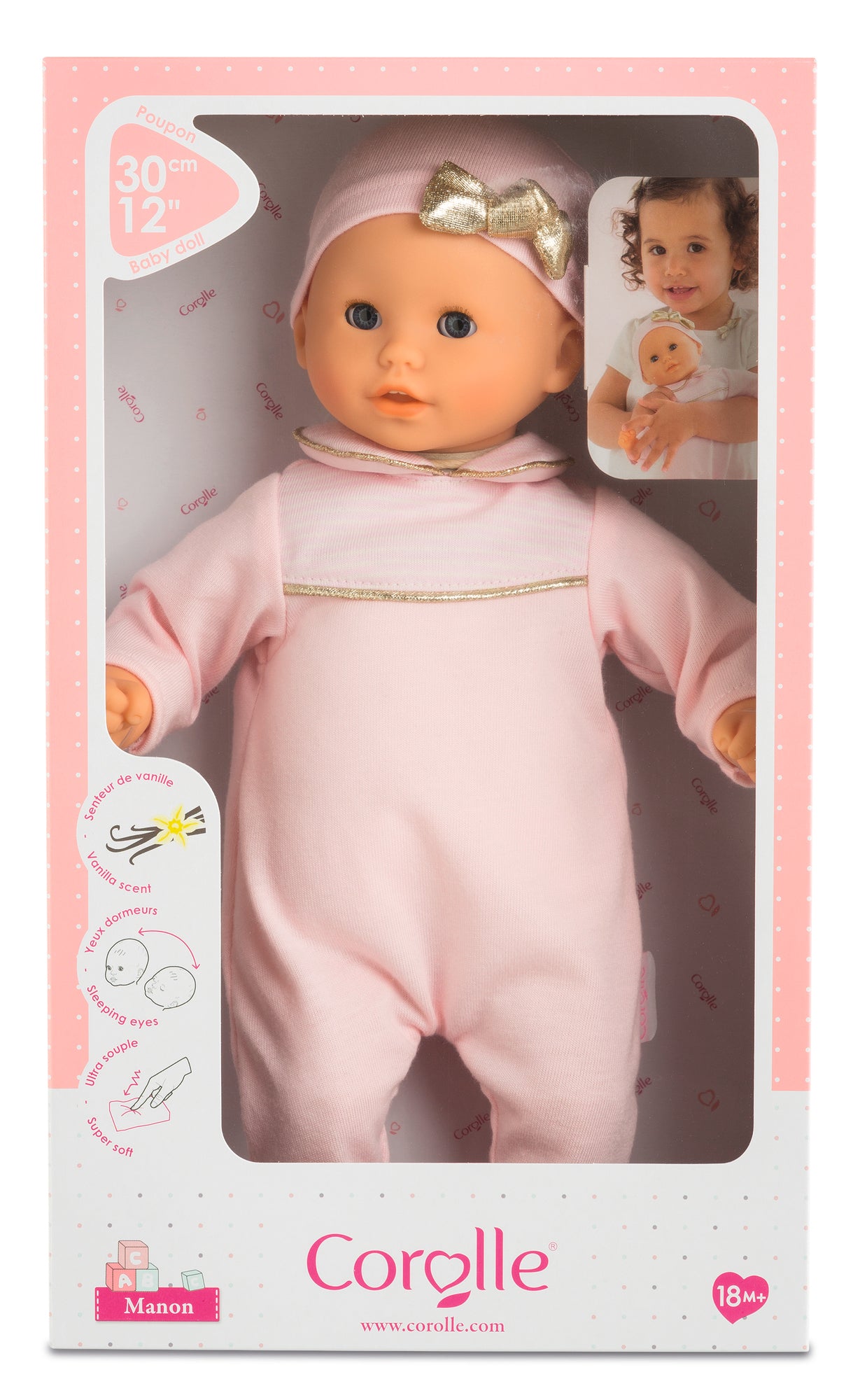 Bébé Calin Manon este o papusa de 30 cm, cu corpul moale,articulat ca al unui bebelus adevarat, iar ochii sai albastri adormiti se inchid atunci cand este pus jos pentru un pui de somn. Fata, bratele si picioarele papusii sunt realizate din vinil moale la atingere, care este delicat parfumat cu vanilie.