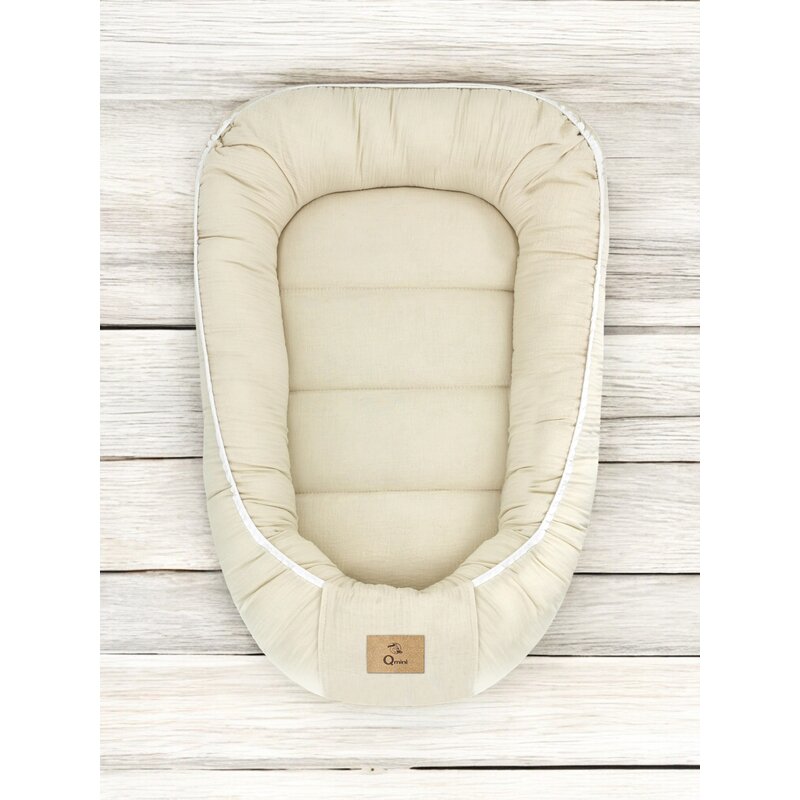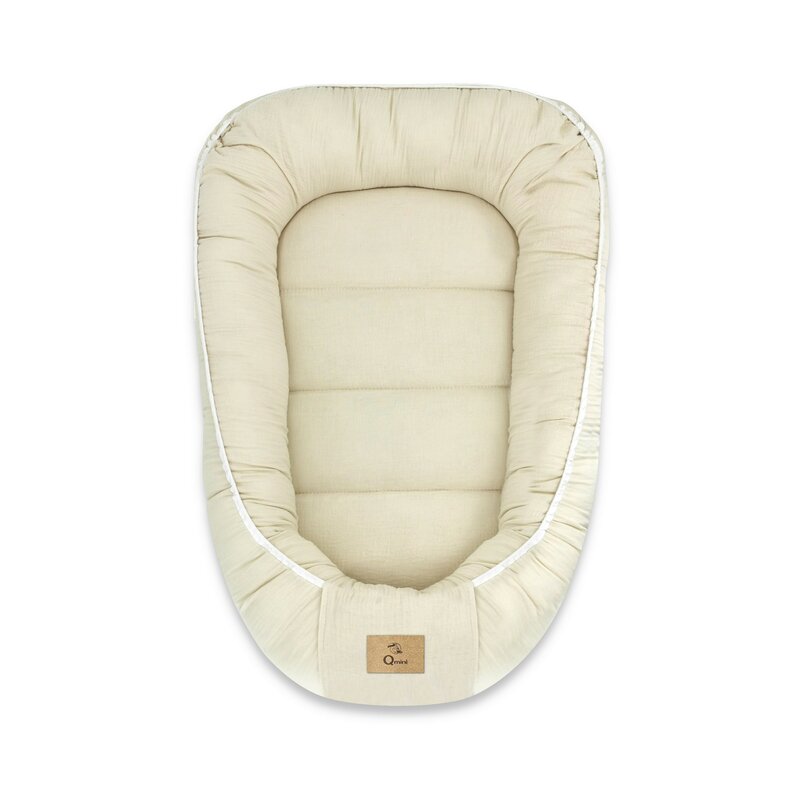 Cosulet bebelus, Qmini, Pentru dormit, Baby Nest 55 x 75 cm, Husa 100% muselina dubla, Material certificat Oeko Tex Standard 100, Warm beige