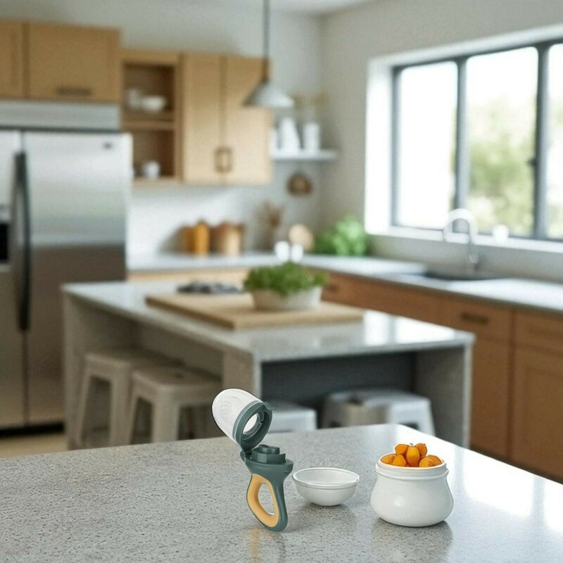 Dispozitiv de hranire, Petite&Mars, Pentru fructe si legume, Include capac de protectie, 6+ luni, Verde/Ocru