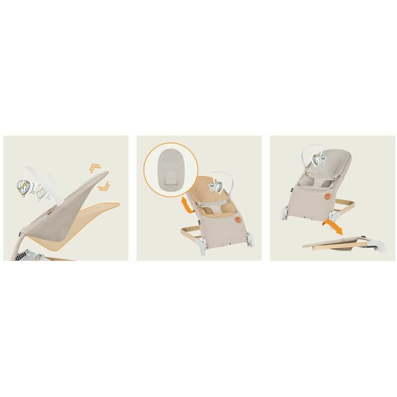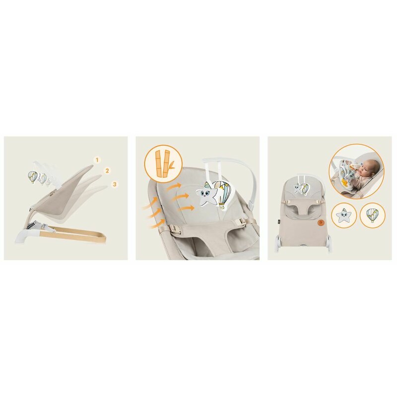 Balansoarul se misca natural odata cu miscarile copilului, stimuland dezvoltarea motorie si simtul echilibrului. Un suport optim pentru cap si coloana este asigurat de o pernuta moale imbracata intr-un material hipoalergenic din bambus. Constructia usoara si pliabila face ca acest balansoar sa fie simplu de depozitat si transportat.