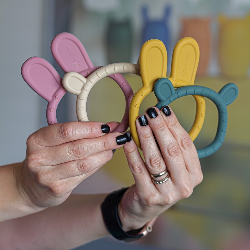 - Ajuta la ameliorarea durerii care apare in timpul procesului de dentitie, deoarece gingiile sunt masate usor in timp ce musca din jucarie.
