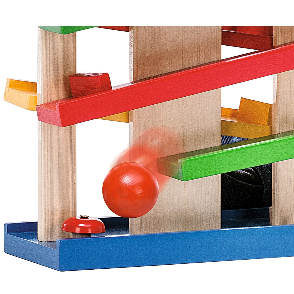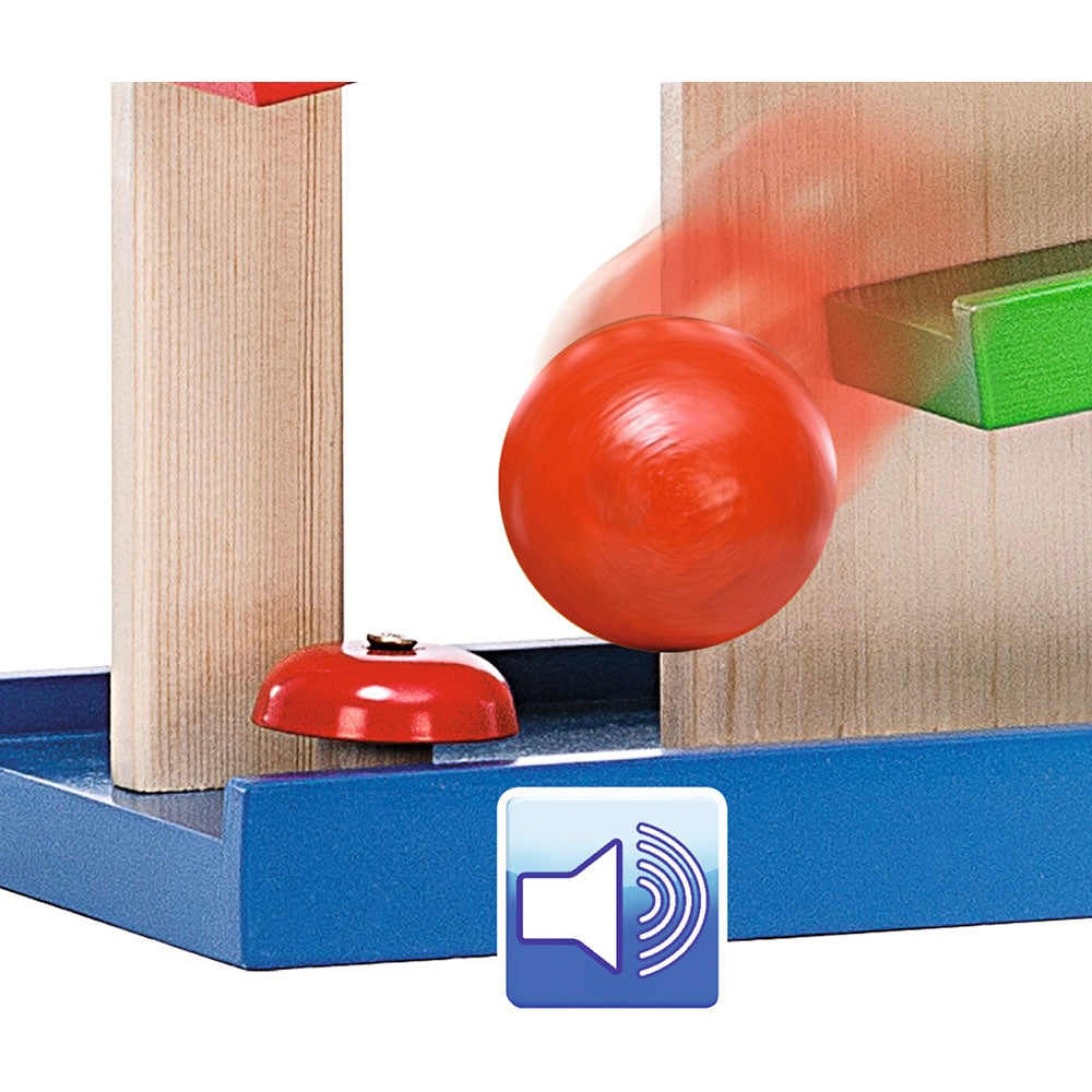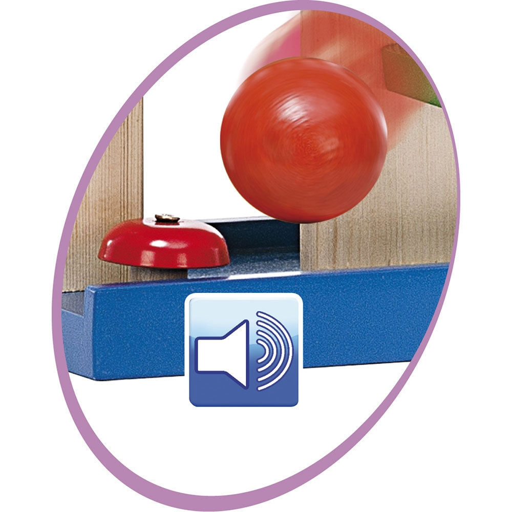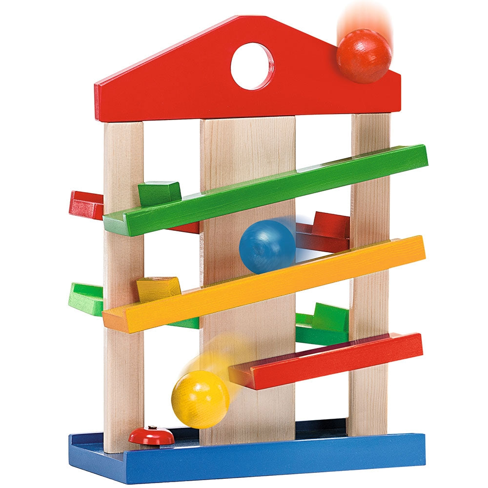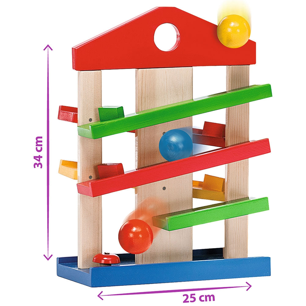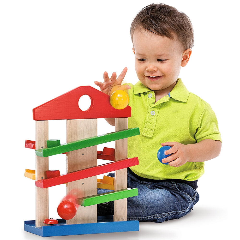 - Bilele se pozitioneaza in partea de sus si se rostogolesc pana jos, urmand traseul. Astfel, micutii vor fi atrasi de aceasta jucarie cu bile, modalitatea in care bila va ajunge de pe o pista pe alta le va capta atentia