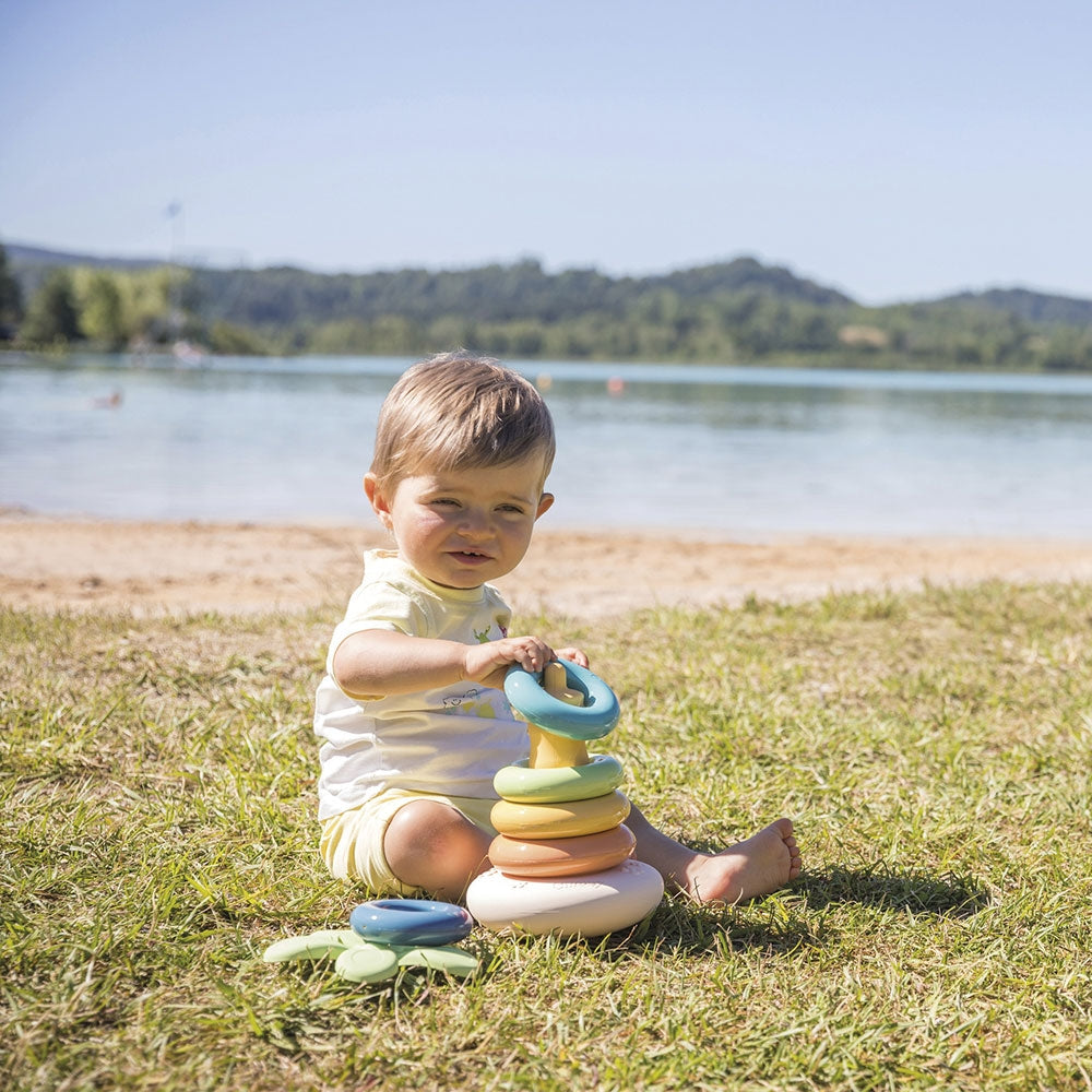 - Copilul tau se poate distra stivuind cele 5 inele colorate pentru a forma o piramida