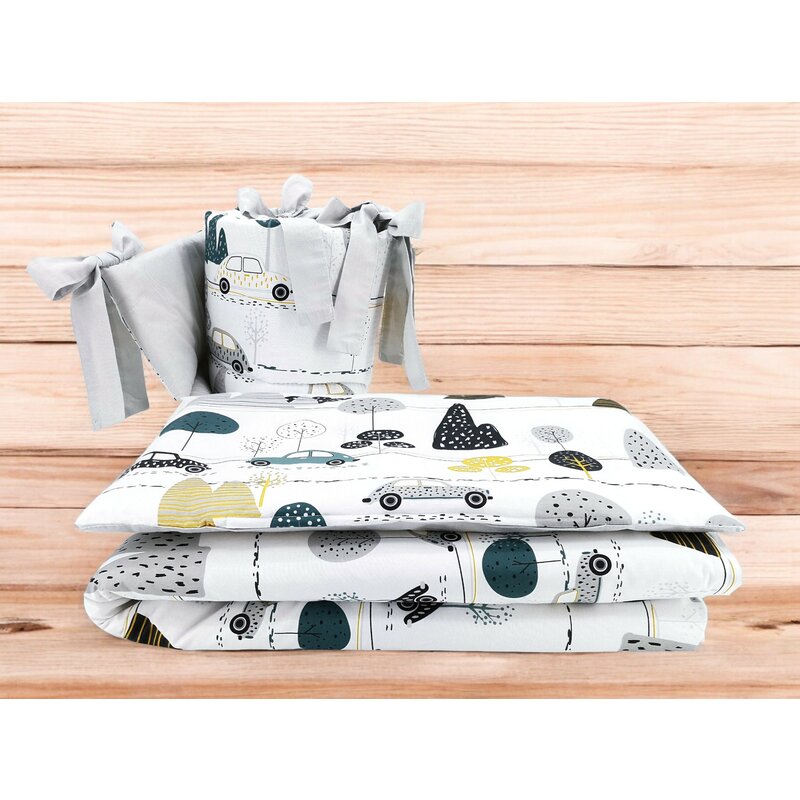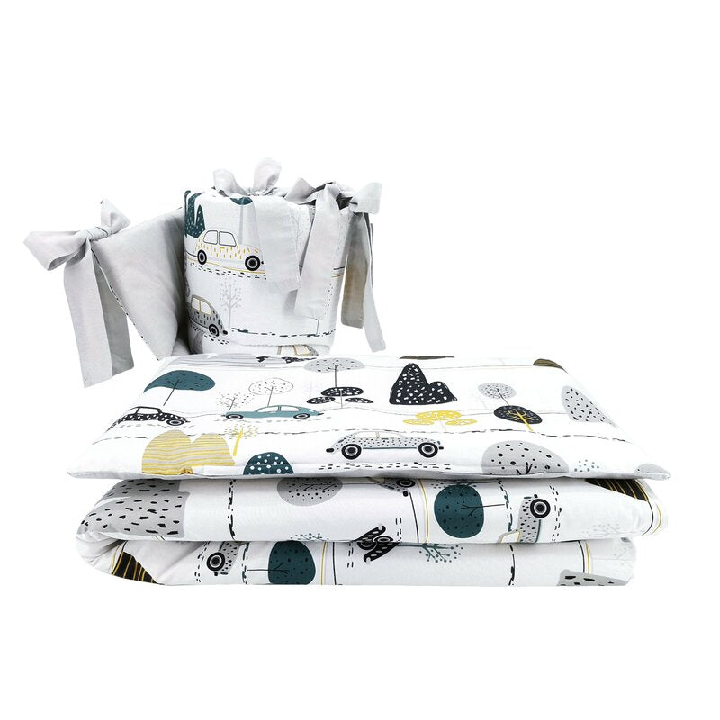 Lenjerie patut cu 3 piese, MimiNu, Pentru patut 120x60 cm, Cu protectie laterala, Din bumbac certificat Oeko Tex Standard 100, Childrens Journey Grey