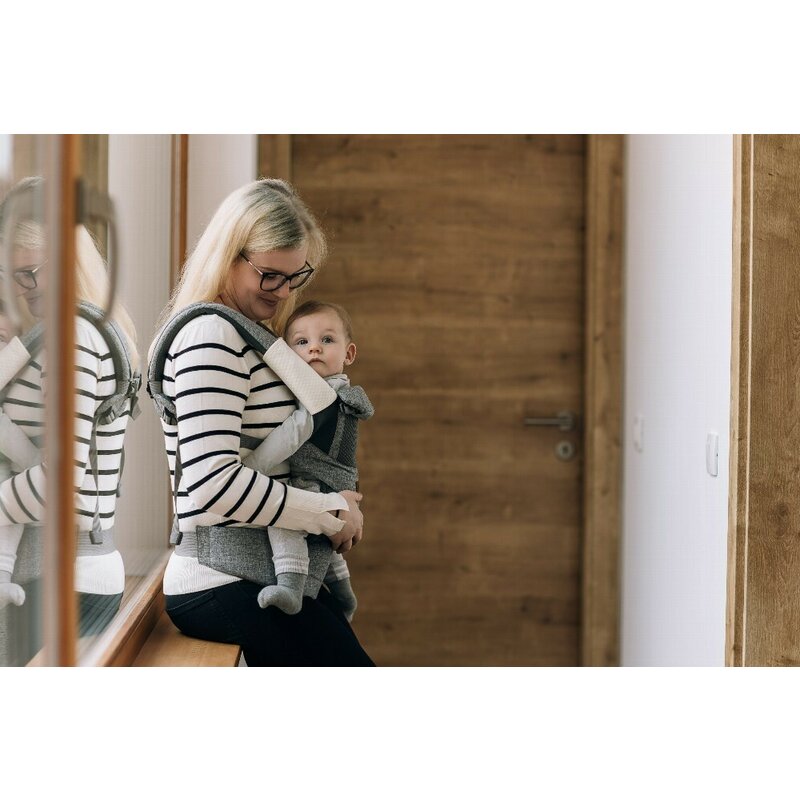 Suportul integrat pentru cap, pliabil si ajustabil, ofera stabilitate cervicala suplimentara, esentiala pentru bebelusii mai mici sau pentru momentele cand acestia adorm. De asemenea, designul care mentine coloana vertebrala intr-o curbură naturala „C” reduce riscul de disconfort si sprijina o postura sanatoasa chiar si in perioadele prelungite de purtare.